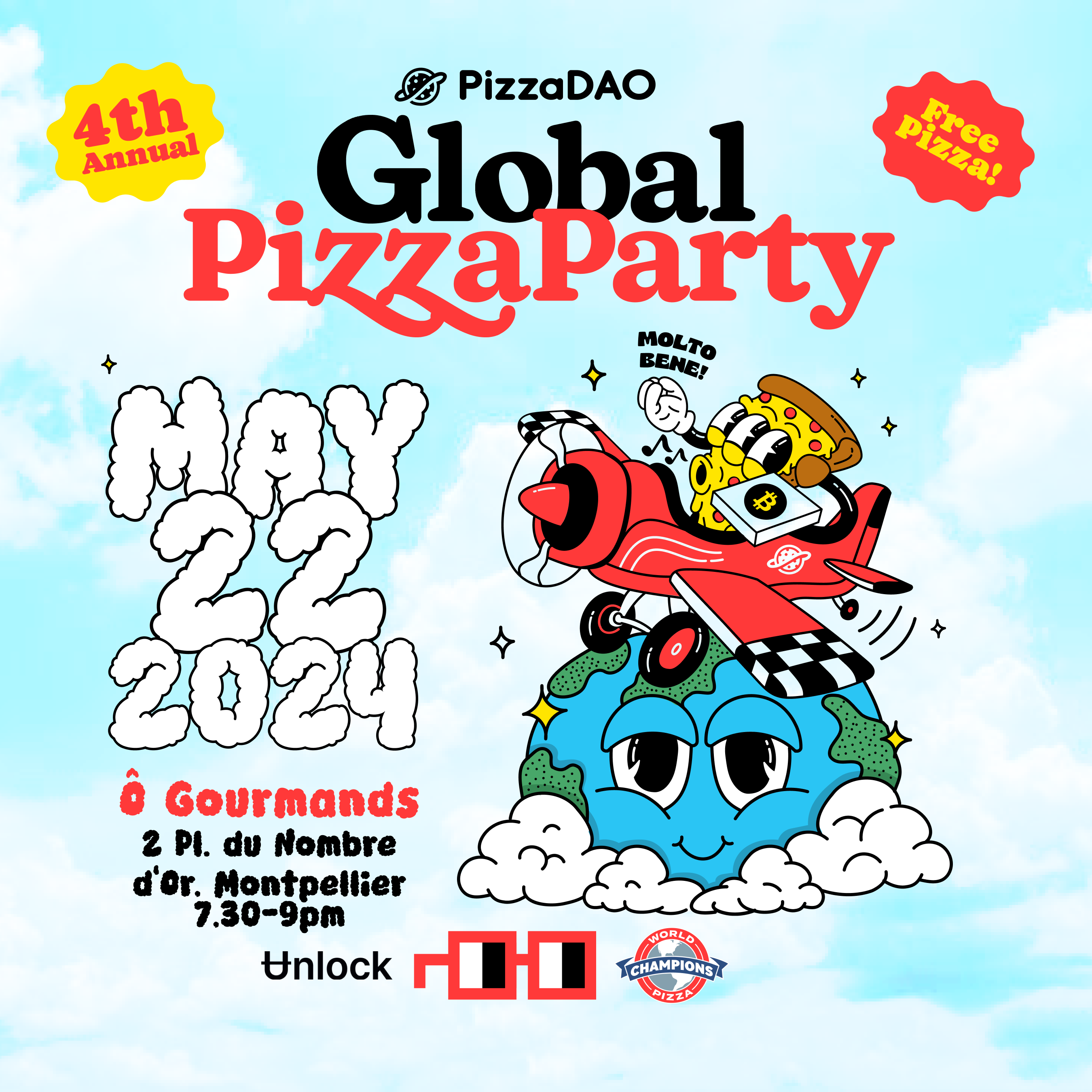 Nous pensons que c'est un événement majeur. En partenariat avec nos amis de NounsDAO, Unlock Protocol, et les World Pizza Champions , nous organisons notre plus grande Pizza Party Mondiale à ce jour ! Nous attendons plus de 10 000 participants au total dans plus de 150 villes à travers le monde.