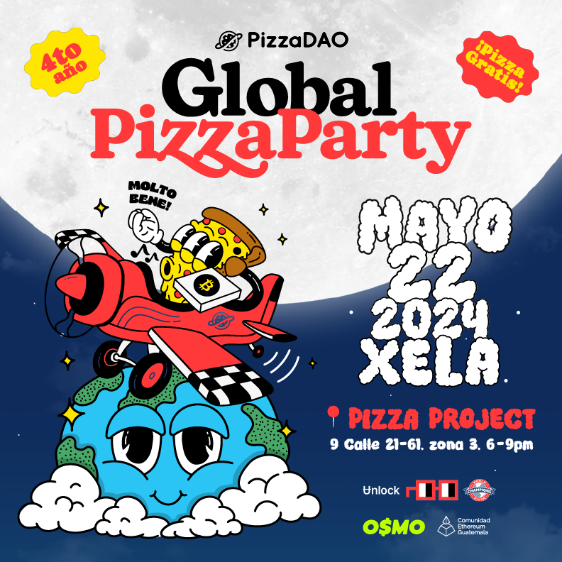 Estás invitado/a al 4to Global Pizza Party anual de PizzaDAO (2do año bajo la luna de She-Lajuj 'Noj!), en honor al Día de la Pizza de Bitcoin! 🥳