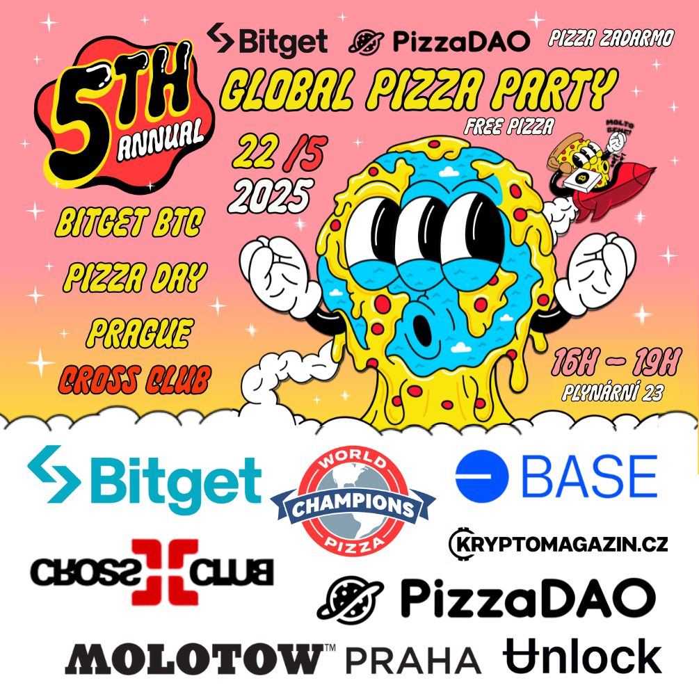 In Prague, Czech Republic, the Cross Club's café will be the one distributing the pizzas. The first 50 people who order a pizza at 4PM at Cross on May 22nd and say the password "BITCOIN" will receive their pizza for free, as it's already been paid for with crypto. We will also give away some cute merch for those answering quiz questions.
