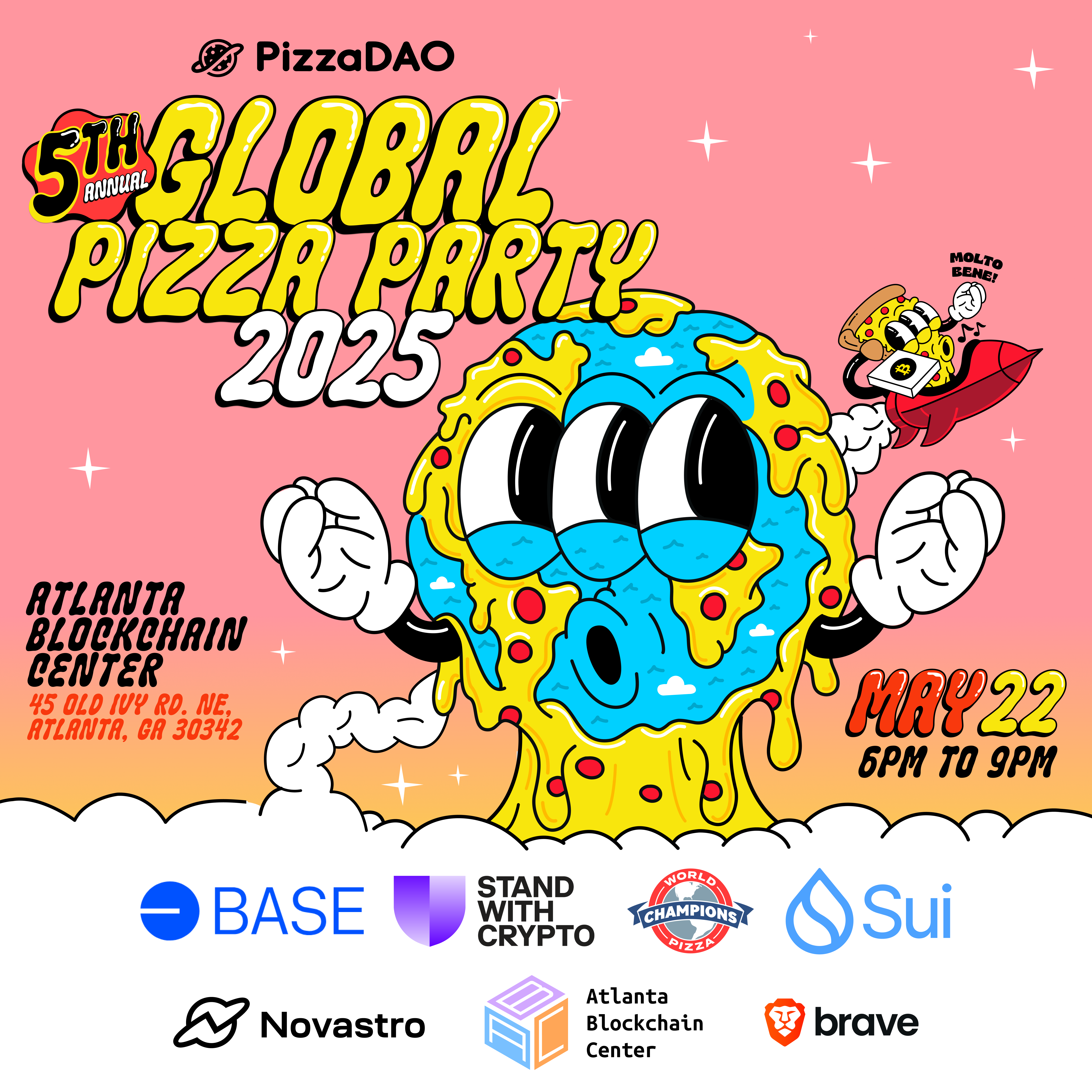 You're invited to PizzaDAO's 5th annual Global Pizza Party in honor of Bitcoin Pizza Day. We're excited to host you in collaboration with our friends Base and the World Pizza Champions.