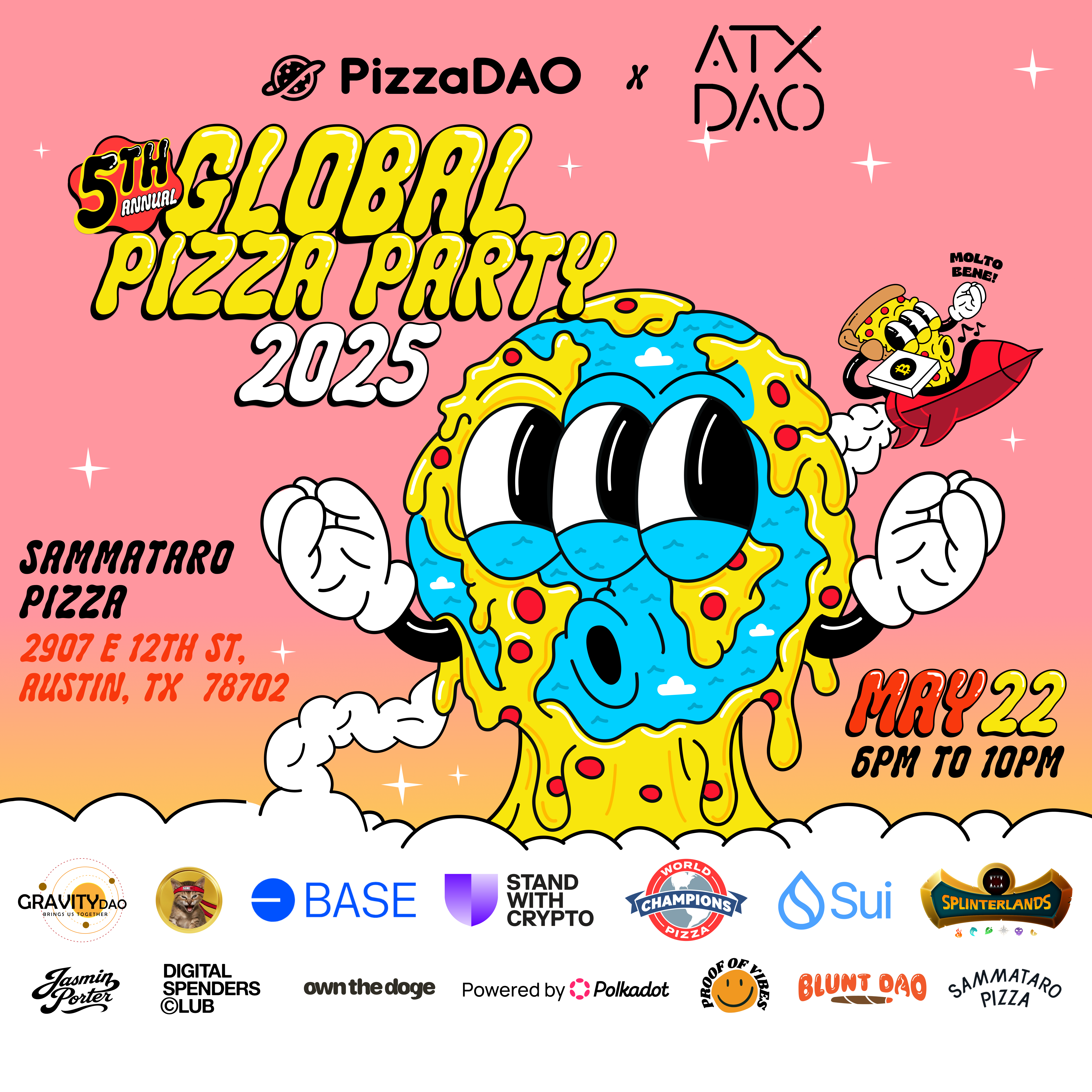 You're invited to PizzaDAO's 5th annual Global Pizza Party in honor of Bitcoin Pizza Day. We're excited to host you in collaboration with our friends Base and the World Pizza Champions.