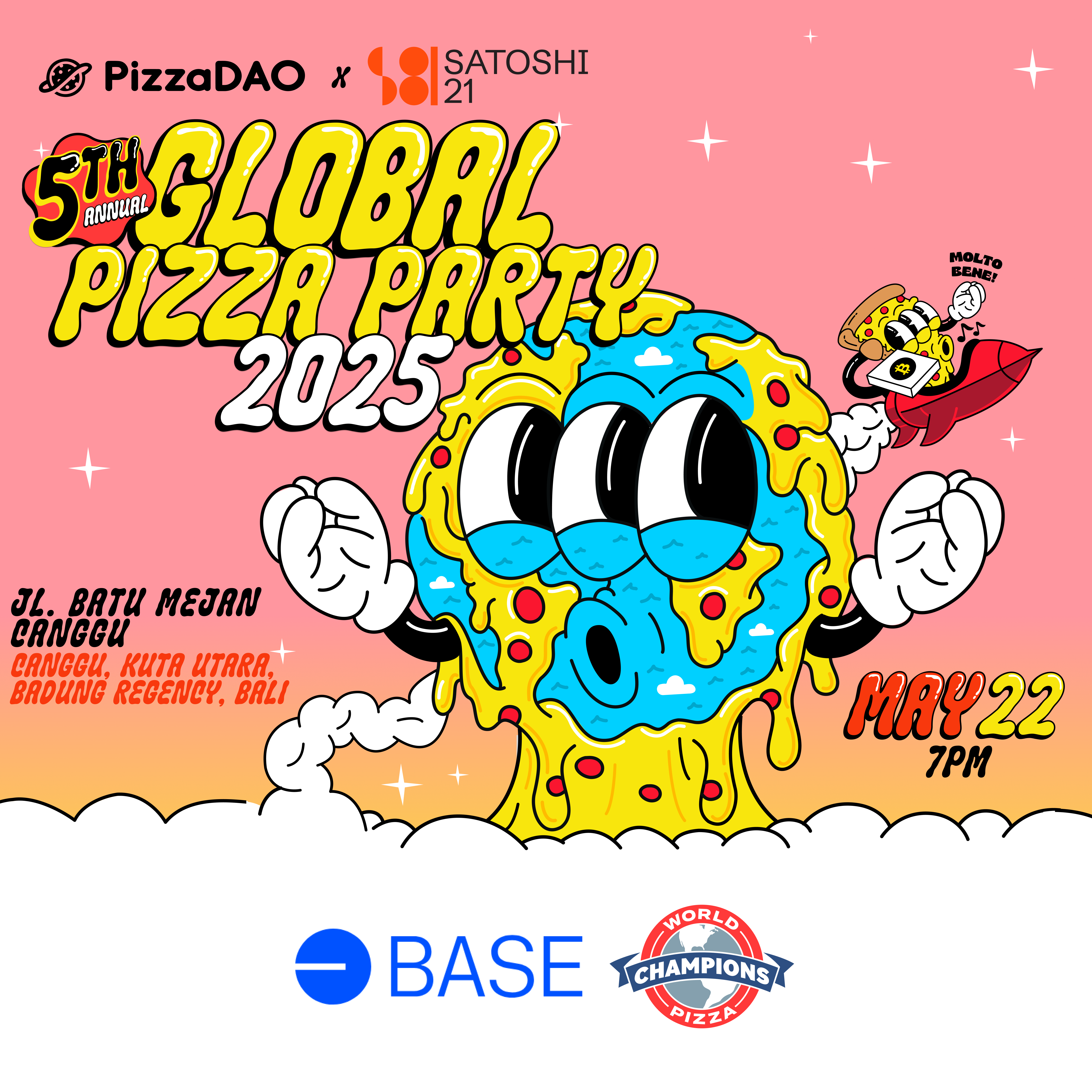 You're invited to PizzaDAO's 5th annual Global Pizza Party in honor of Bitcoin Pizza Day. We're excited to host you in collaboration with our friends Base and the World Pizza Champions.