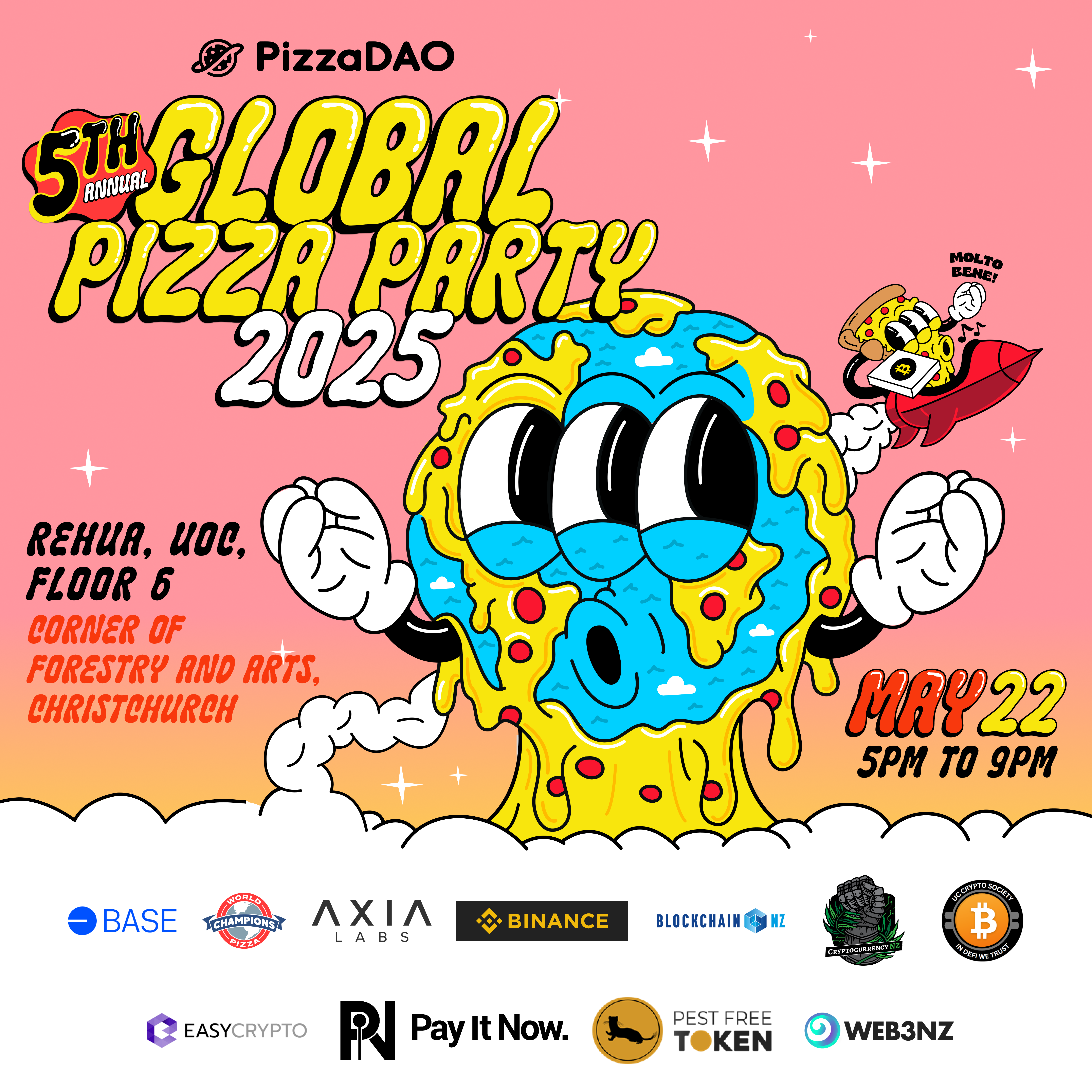 You're invited to PizzaDAO's 5th annual Global Pizza Party in honor of Bitcoin Pizza Day. We're excited to host you in collaboration with our friends Base and the World Pizza Champions.