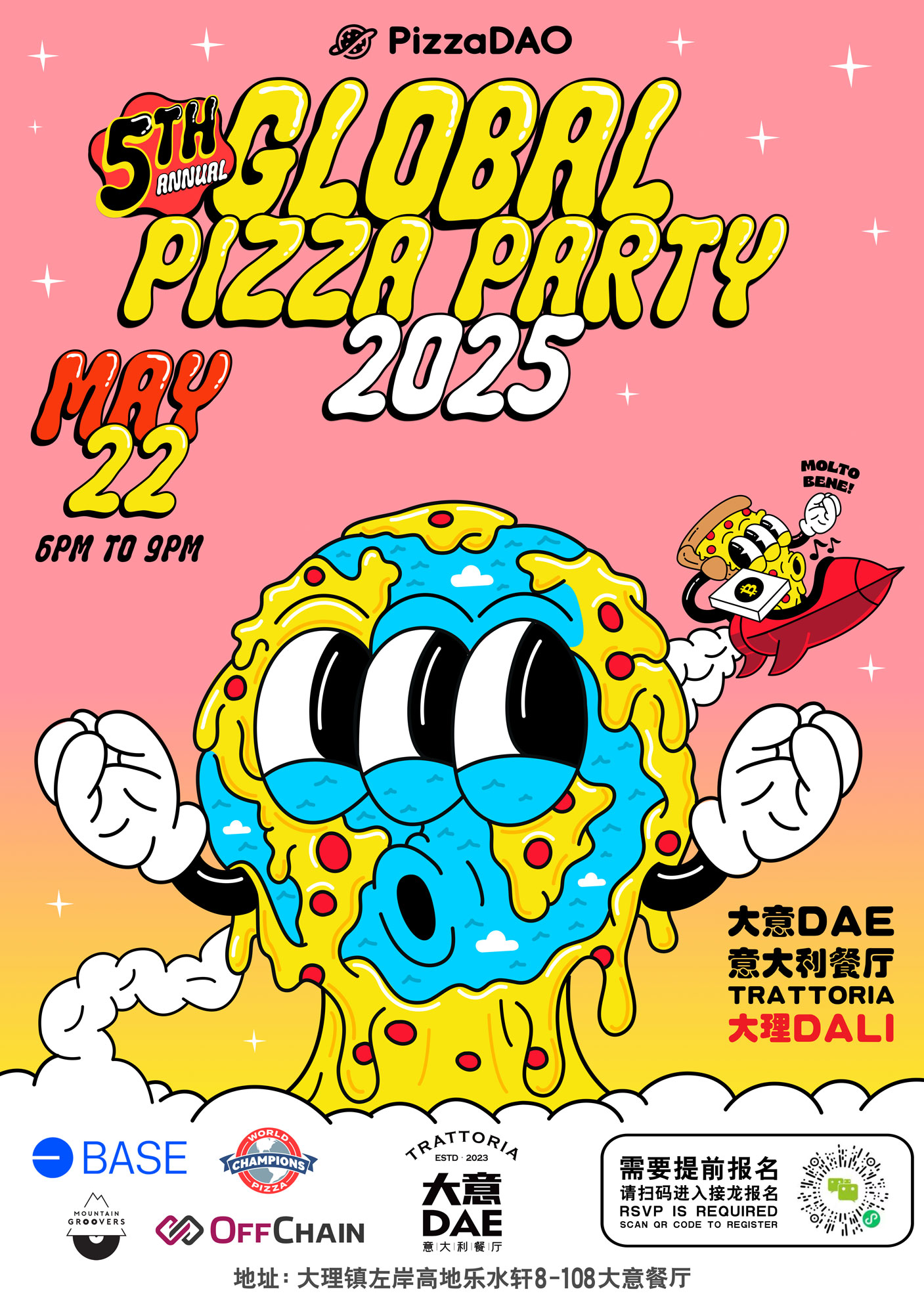 由OffChain Dali联手PizzaDAO、Base 和 世界披萨冠军团队 举办的第5届全球披萨日派对来啦!5月22日(周四),全球400多个城市,超25,000人将共同参与庆祝! Join OffChain Dali, in collaboration with PizzaDAO, Base, and the World Pizza Champions, for the 5th Annual Global Pizza Party — a worldwide event uniting over 25,000 people in 400+ cities on Thursday, May 22.