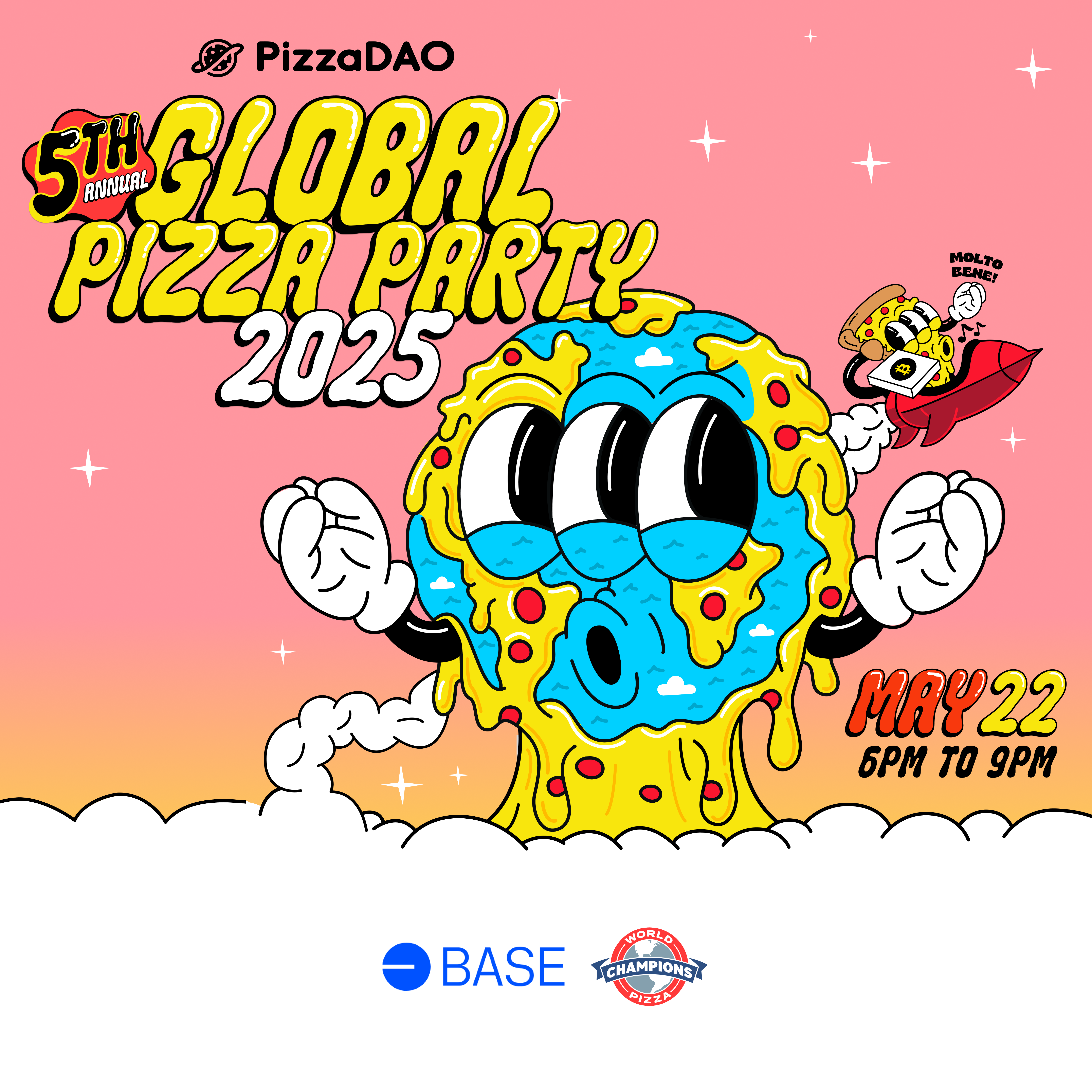 You're invited to PizzaDAO's 5th annual Global Pizza Party in honor of Bitcoin Pizza Day. We're excited to host you in collaboration with our friends Base and the World Pizza Champions.