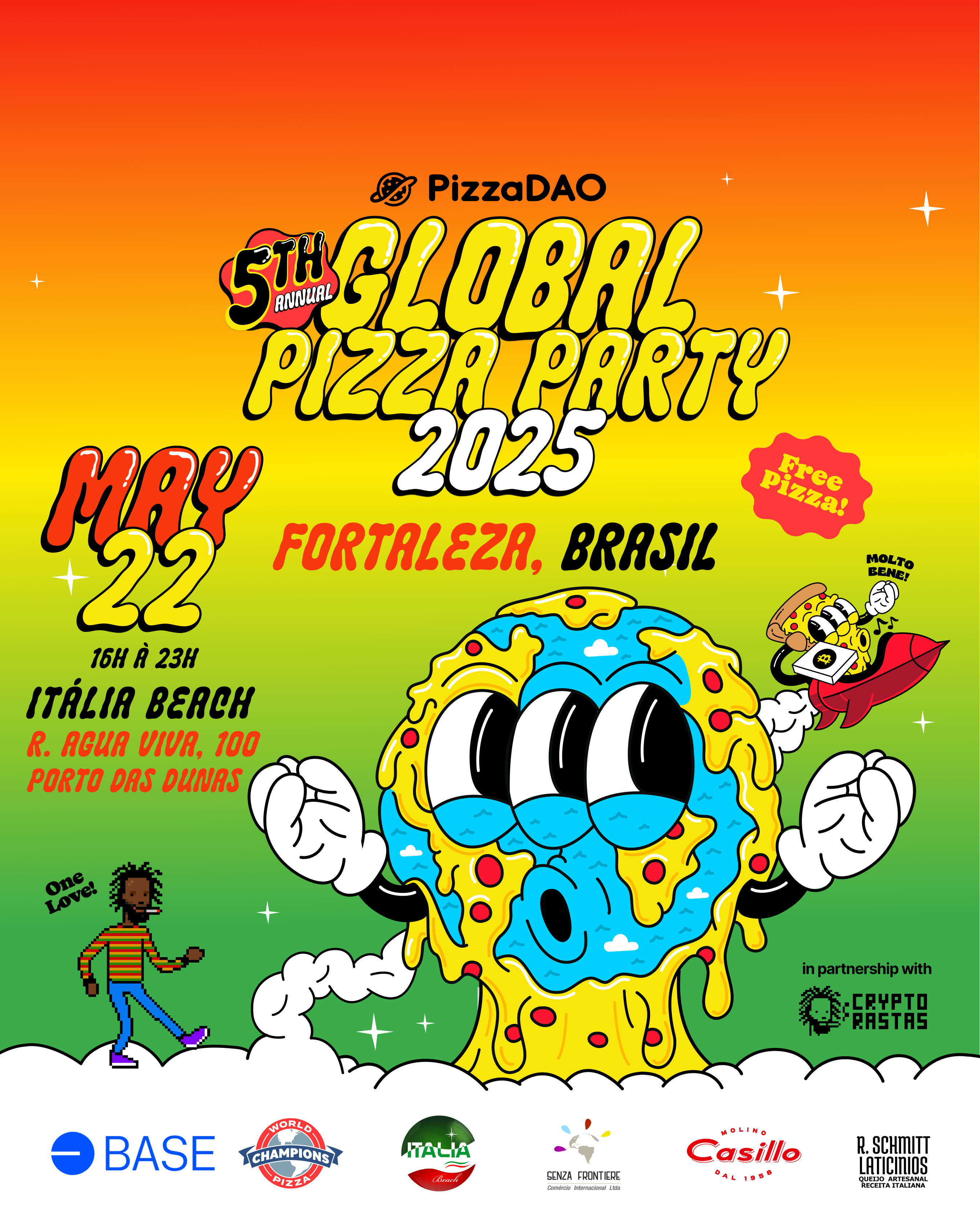 Você é nosso convidado para a 5ª Global Pizza Party anual da PizzaDAO. Em Fortaleza a festa está sendo organizada em parceria com a comunidade CryptoRastas.