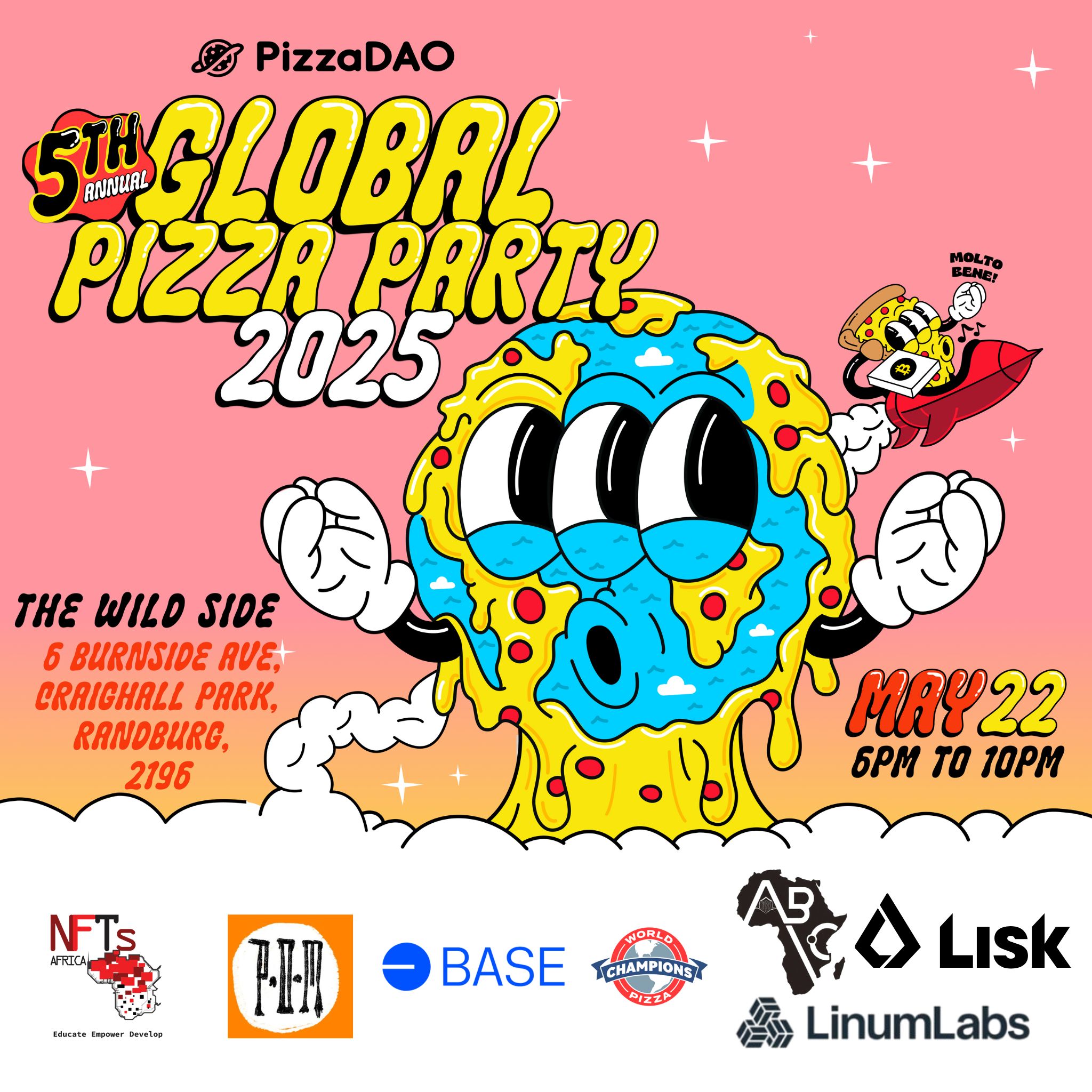 You're invited to PizzaDAO's 5th annual Global Pizza Party in honor of Bitcoin Pizza Day. We're excited to host you in collaboration with our friends Base and the World Pizza Champions.
