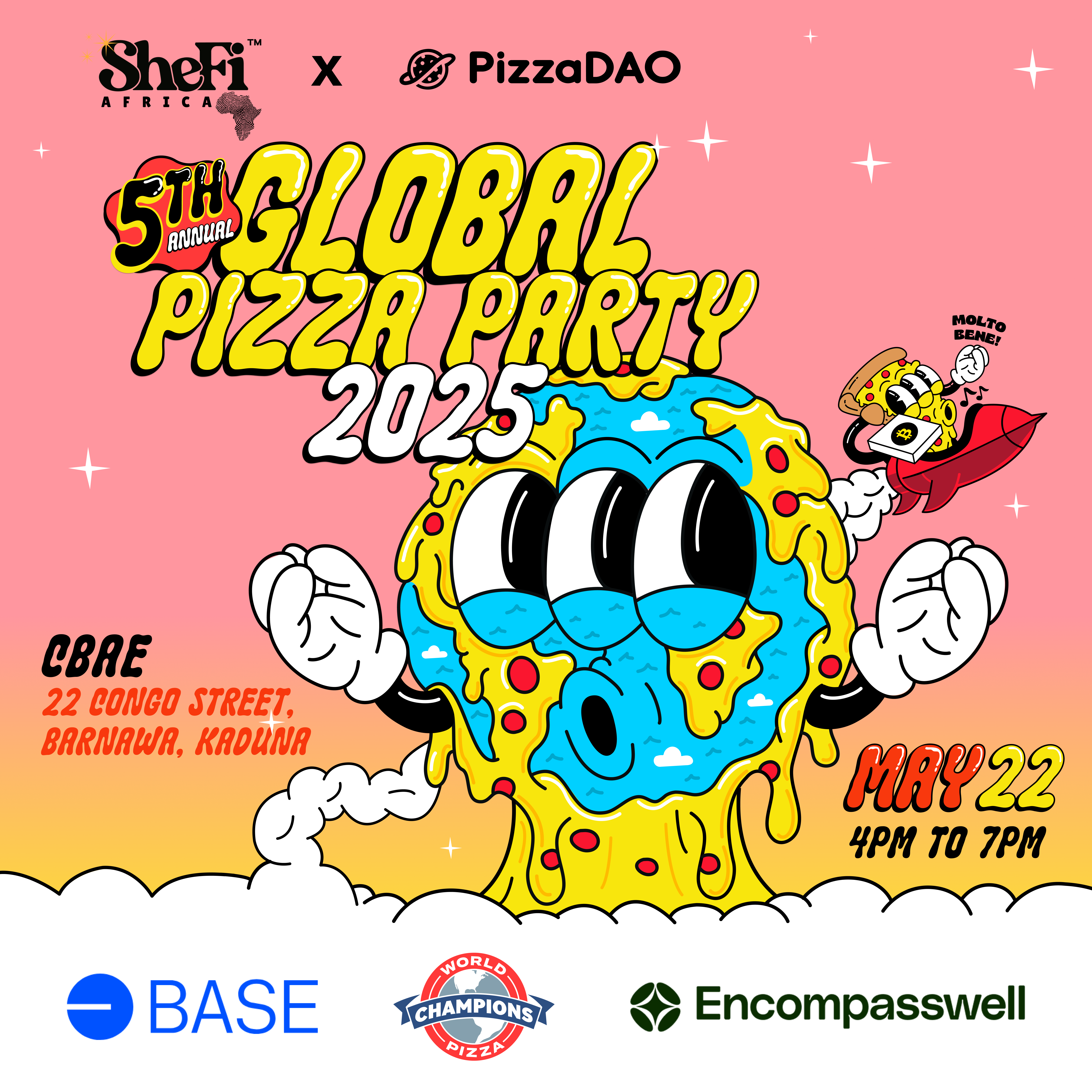 You're invited to PizzaDAO's 5th annual Global Pizza Party in honour of Bitcoin Pizza Day. We're excited to host you in collaboration with our friends SheFi Africa, Base, EncompassWell and the World Pizza Champions.