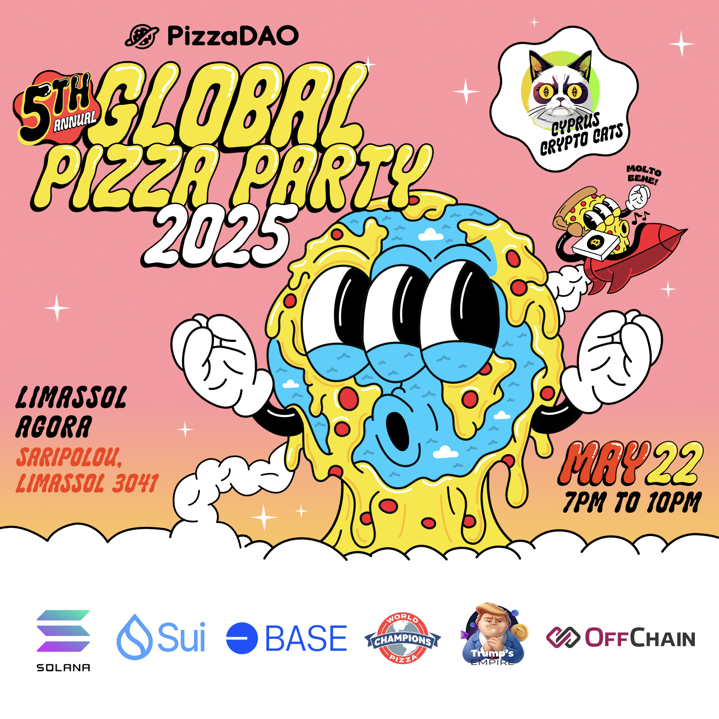 We will be organizing Global Pizza Party in Limassol for the second time, together with our partner - Cyprus Crypto Cats. The event is supported by local Sui, Solana and OffChain communities as well as Trump's Empire - a Telegram-based game.
