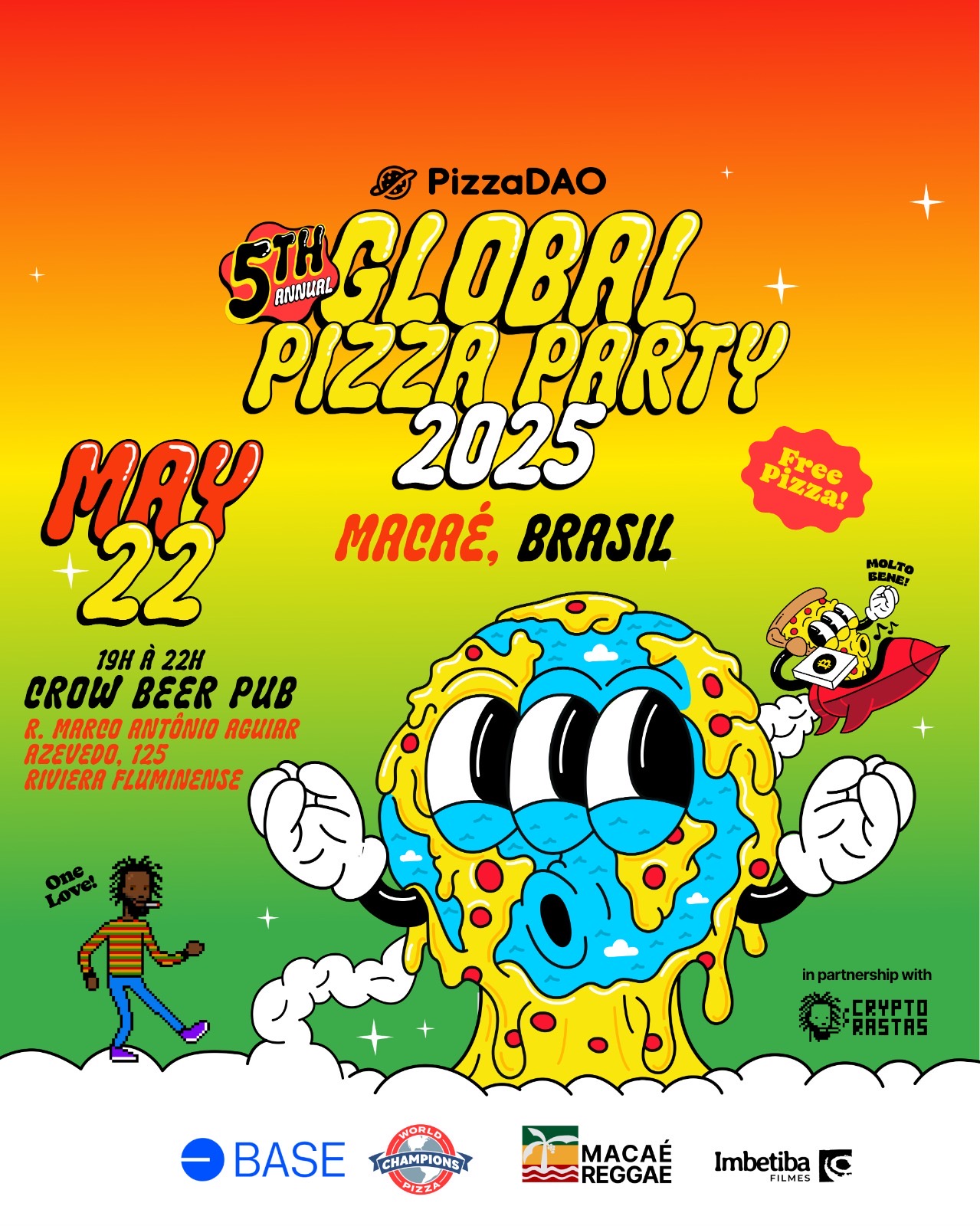 Você é nosso convidado para a 5ª Global Pizza Party anual da PizzaDAO. Em Macaé, uma festa está sendo organizada em parceria com a comunidade CryptoRastas. Já se passaram 15 anos desde 22 de maio de 2010, quando Laszlo Hanyecz comprou duas pizzas por 10.000 bitcoins. Hoje, 10.000 bitcoins compram muito mais do que duas pizzas! Esperamos mais de 25.000 participantes em mais de 400 cidades ao redor do mundo. Mais informações: https://globalpizzaparty.xyz