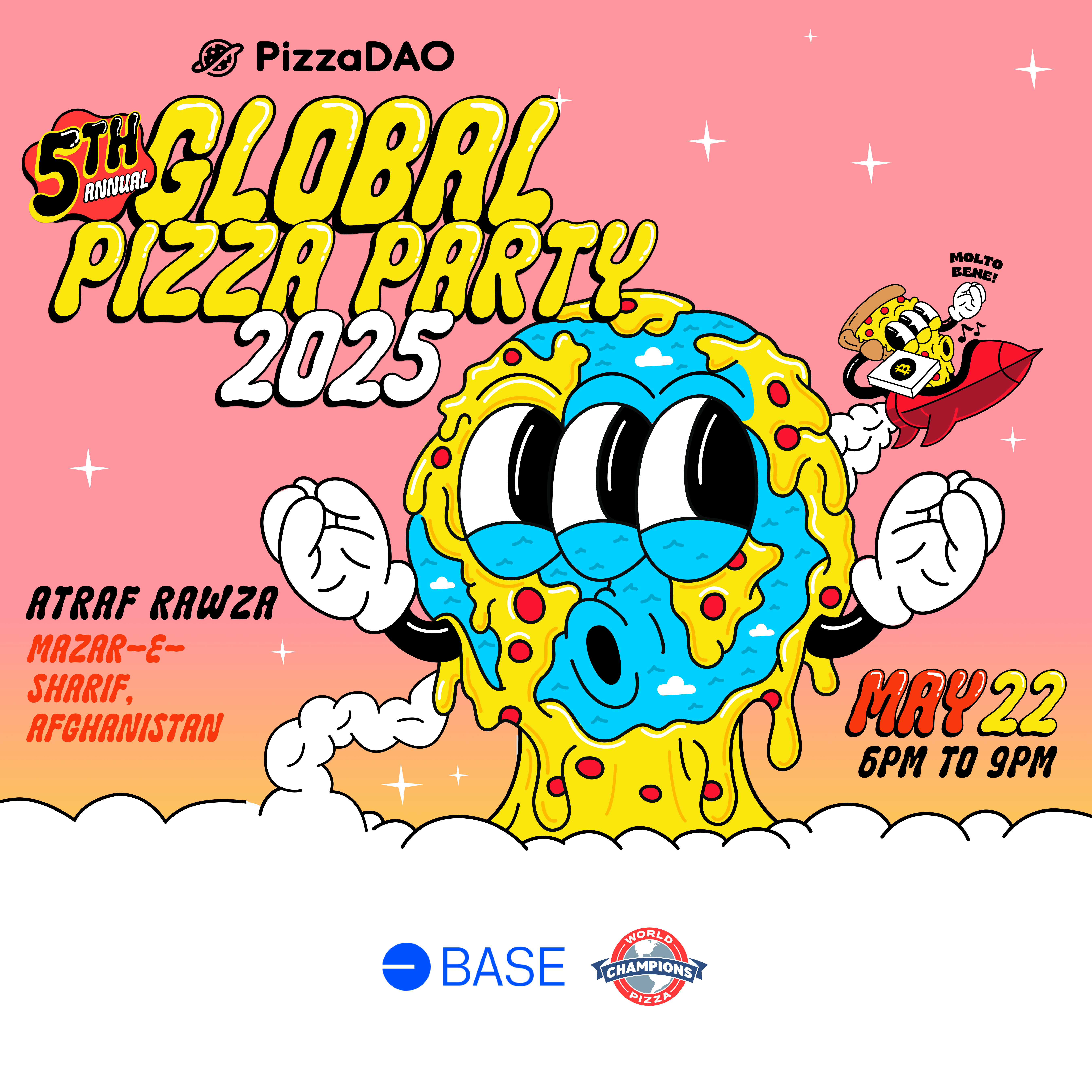 You're invited to PizzaDAO's 5th annual Global Pizza Party in honor of Bitcoin Pizza Day. We're excited to host you in collaboration with our friends Base and the World Pizza Champions.