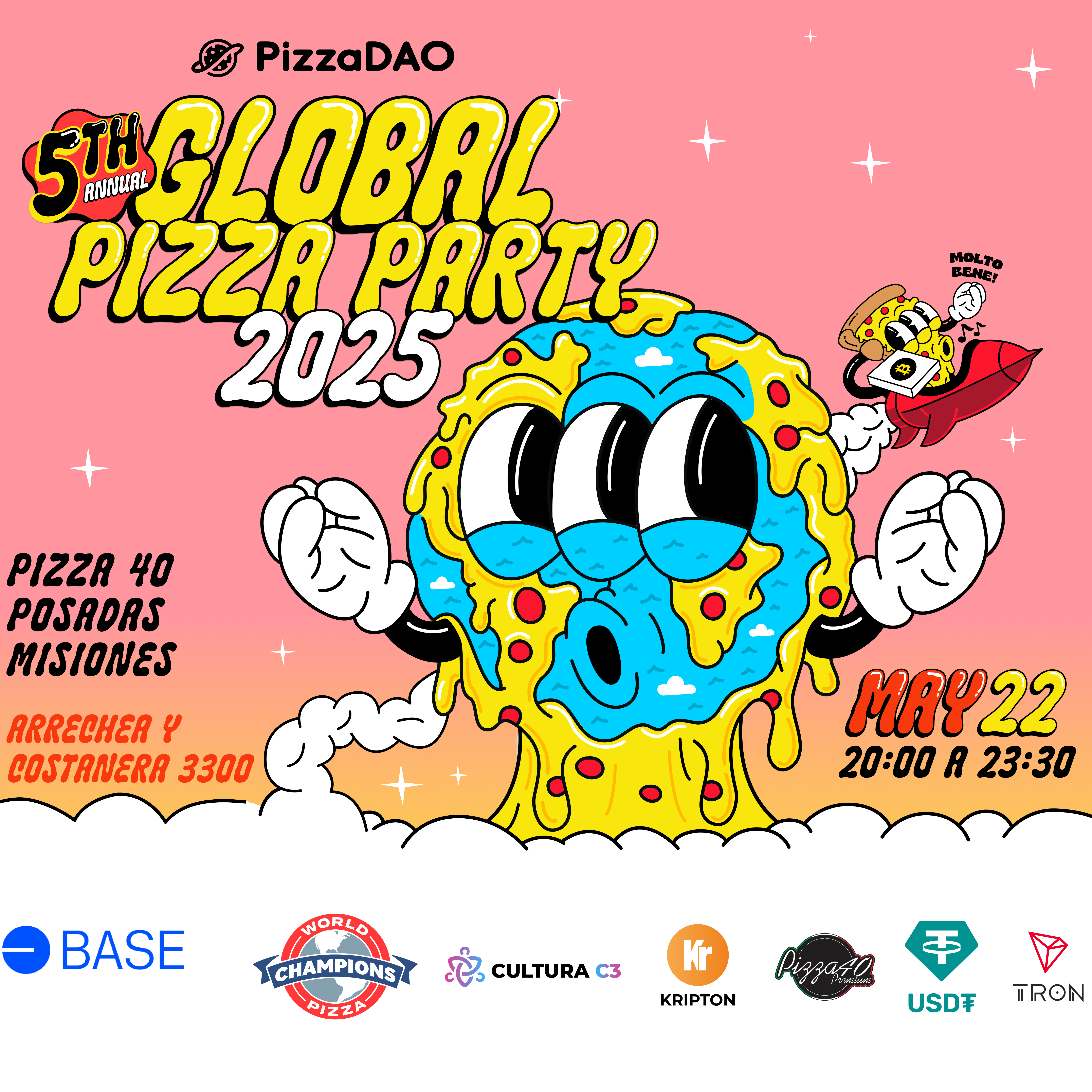 Estás invitado a la 5ª versión del Global Pizza Party mundial de PizzaDAO Y Cultura C3 en honor al Bitcoin Pizza Day, en Posadas Misiones.
