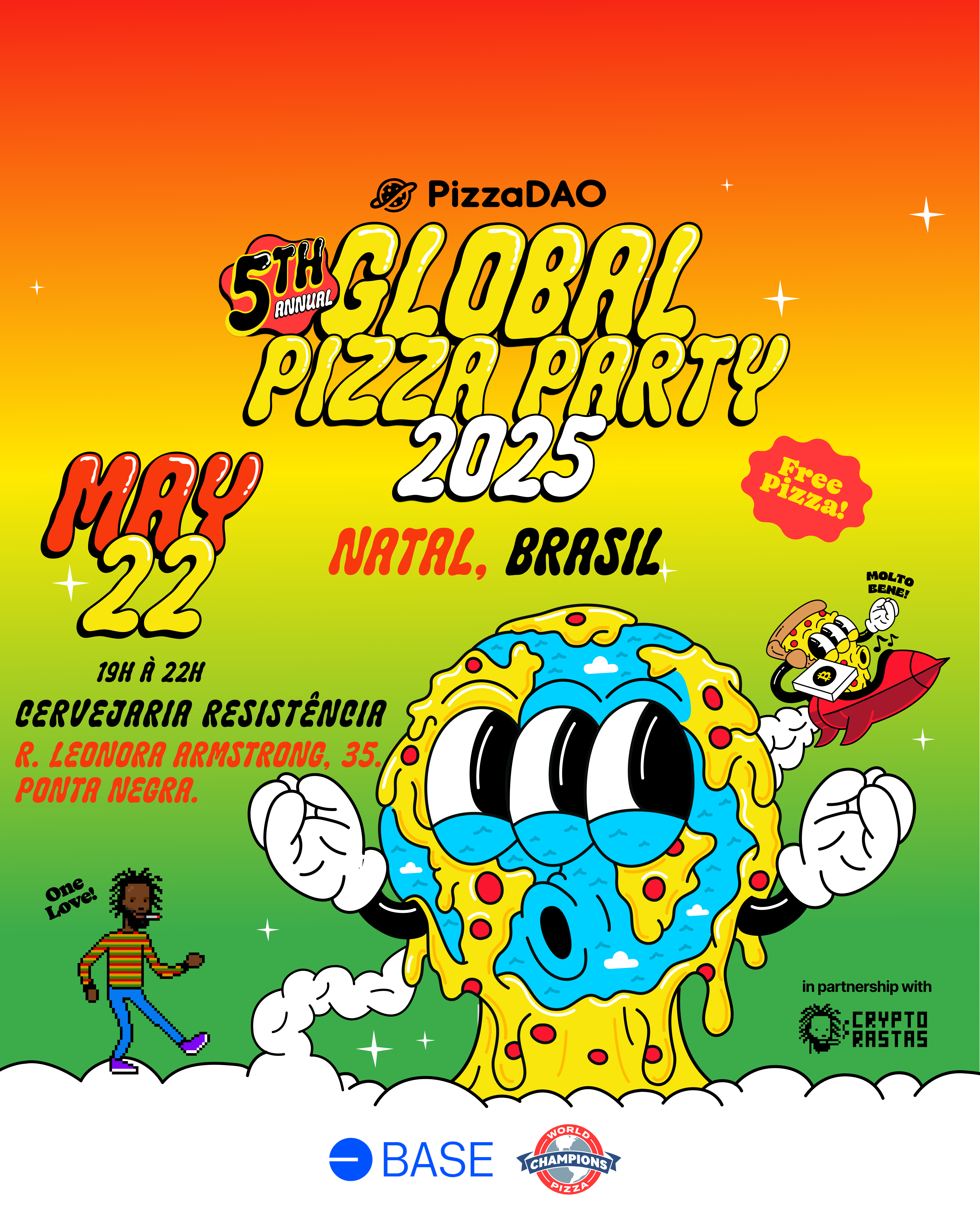 Você é nosso convidado para a 5ª Global Pizza Party anual da PizzaDAO. Em Natal a festa está sendo organizada em parceria com a comunidade CryptoRastas.