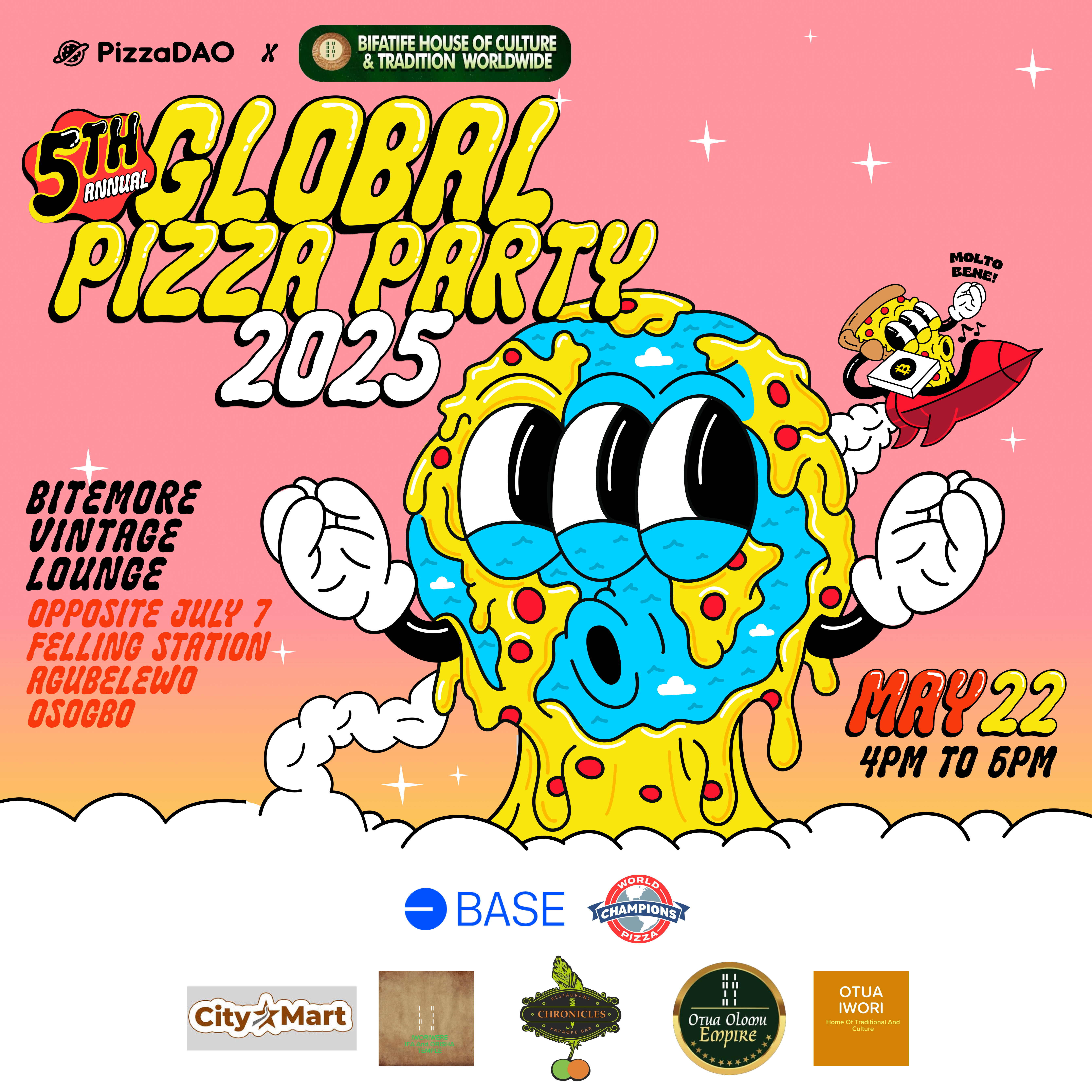 You're invited to PizzaDAO's 5th annual Global Pizza Party in honor of Bitcoin Pizza Day. We're excited to host you in collaboration with our friends Base and the World Pizza Champions.