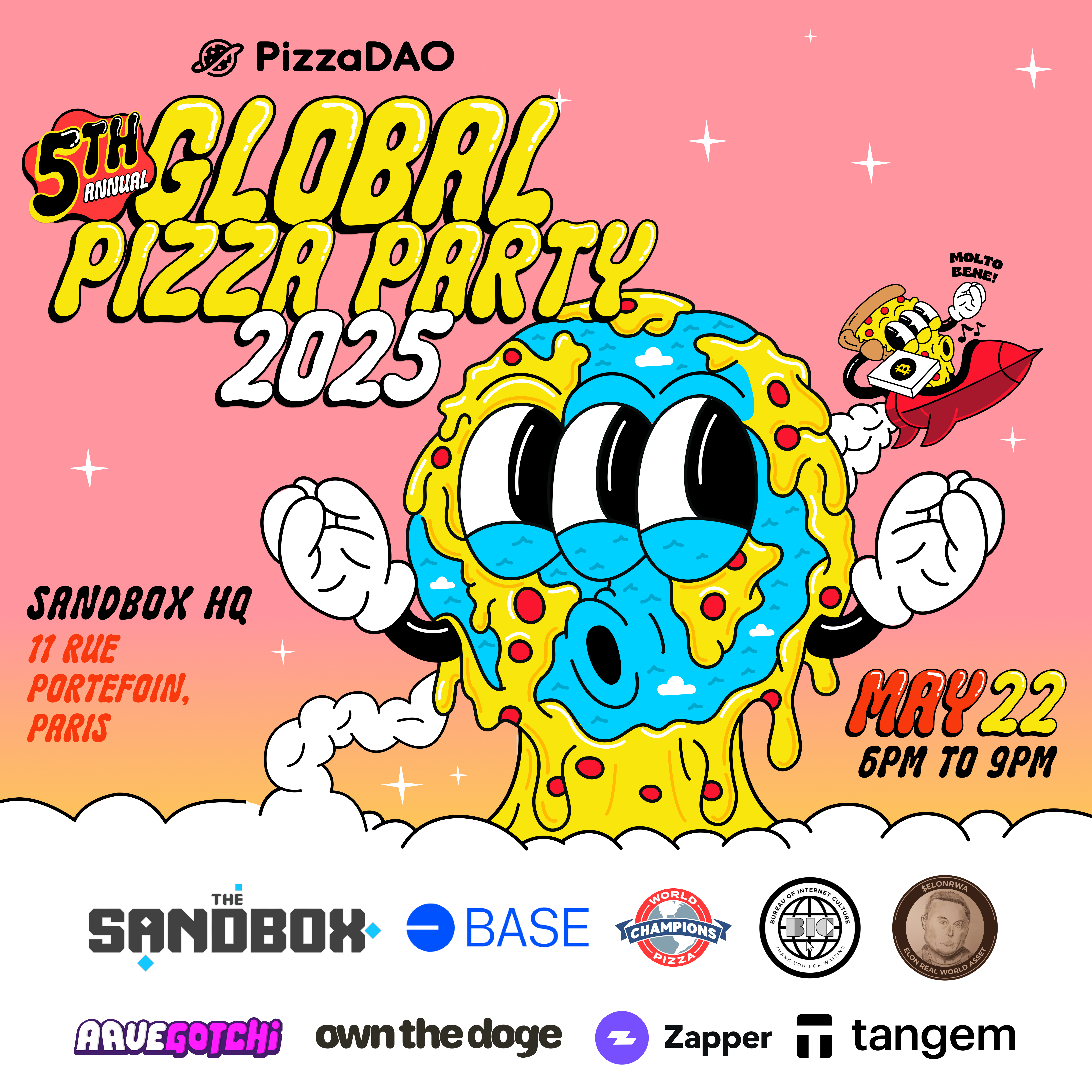 You're invited to PizzaDAO's 5th annual Global Pizza Party in honor of Bitcoin Pizza Day. We're excited to host you in collaboration with our friends Base and the World Pizza Champions.