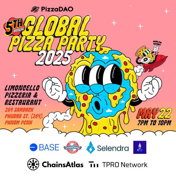 You're invited to PizzaDAO's 5th annual Global Pizza Party in honor of Bitcoin Pizza Day. We're excited to host you in collaboration with our friends Base and the World Pizza Champions.