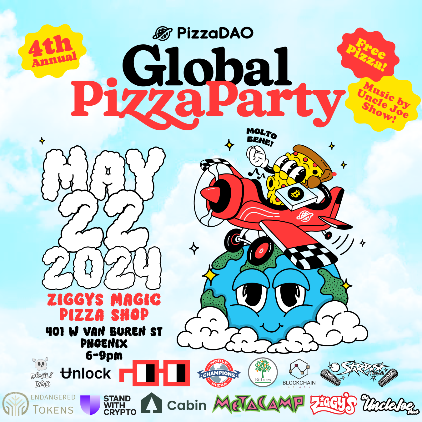 You're invited for free pizza, free drinks, music by Uncle Joe Show, and good vibes at PizzaDAO's 4th annual Global Pizza Party in honor of Bitcoin Pizza Day.