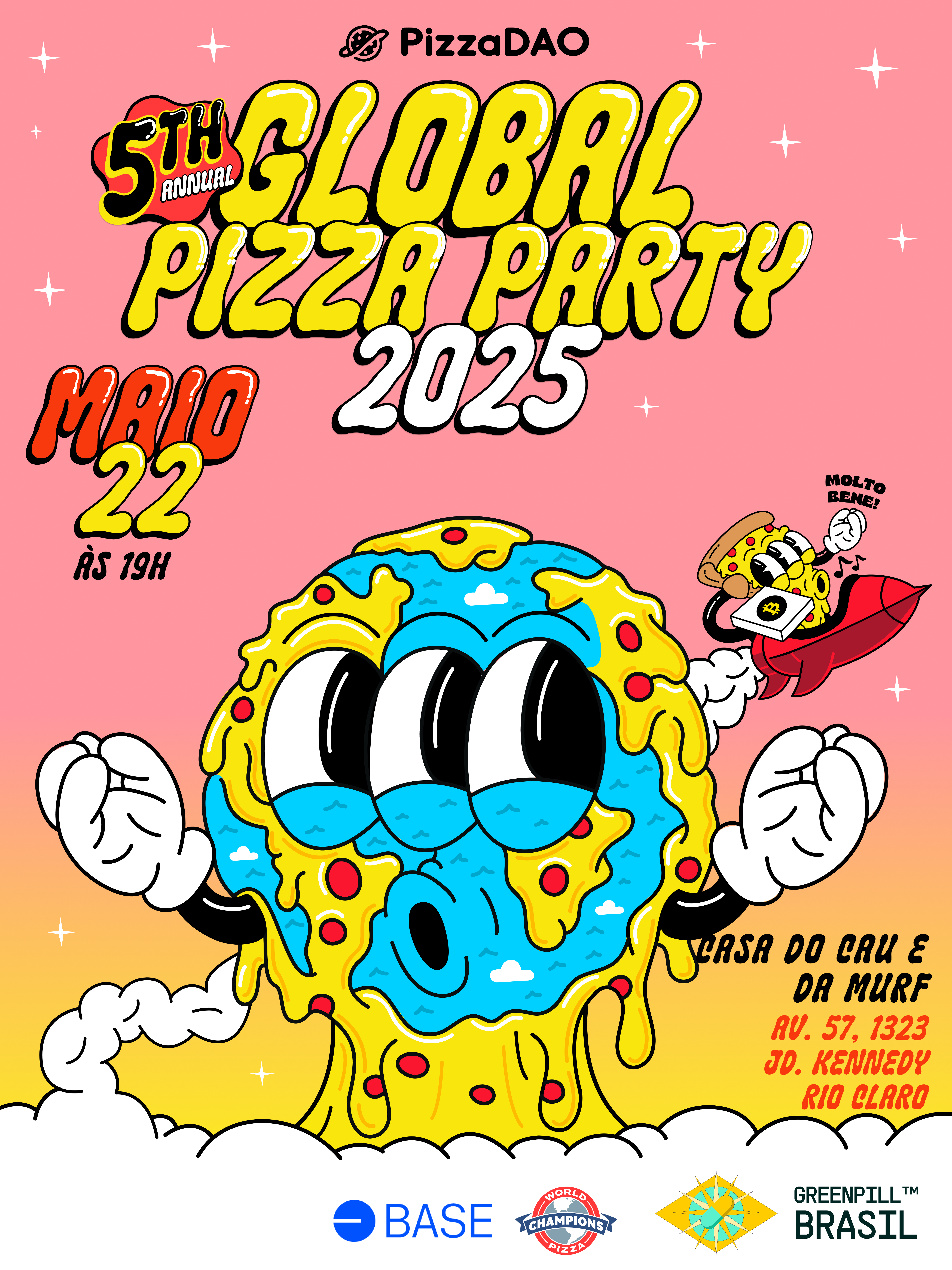 Você está convidado para celebrar a 5ª Global Pizza Party. Um evento promovido e patrocinado pela PizzaDAO, Base e World Pizza Champions.