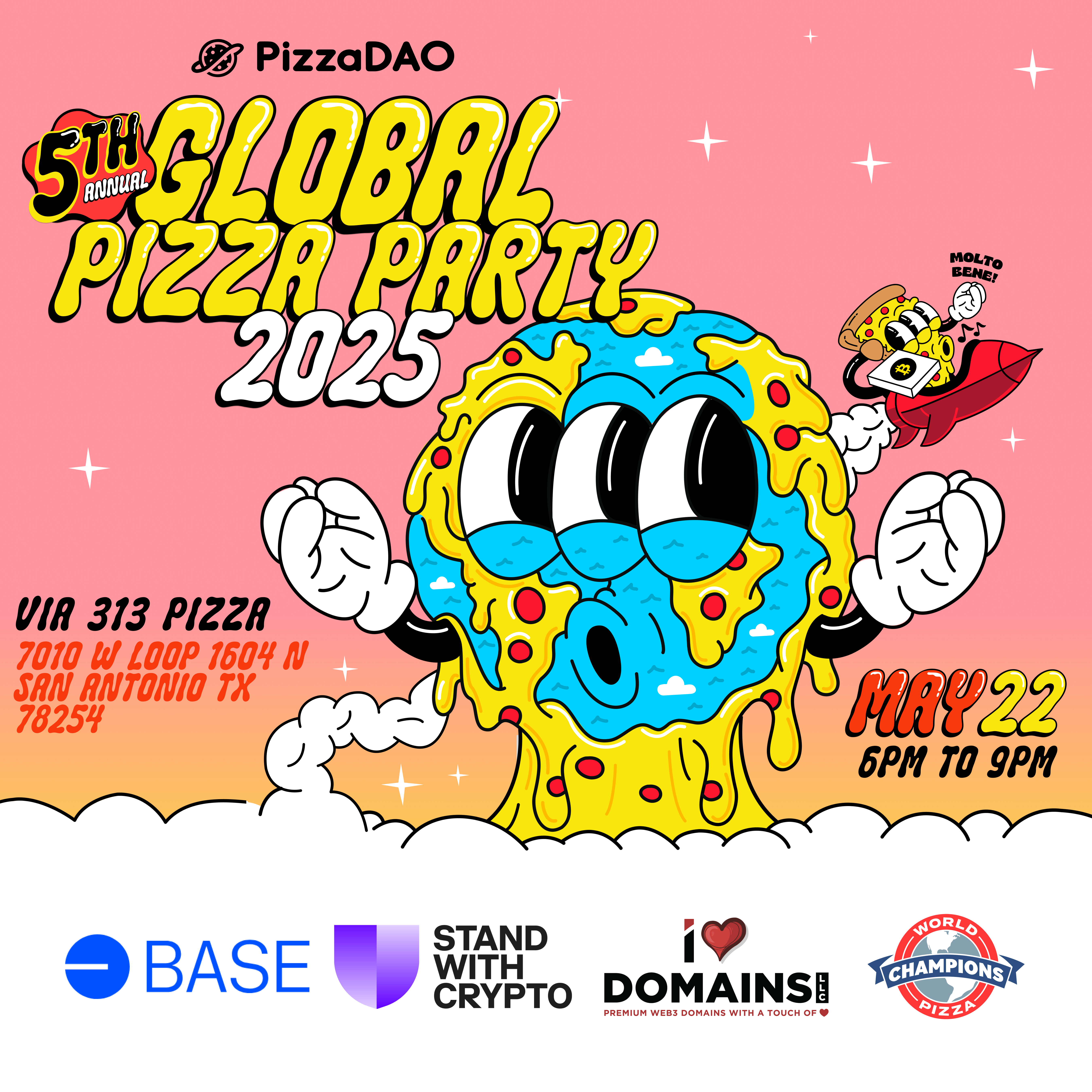 You're invited to PizzaDAO's 5th annual Global Pizza Party in honor of Bitcoin Pizza Day. We're excited to host you in collaboration with our friends Base and the World Pizza Champions.