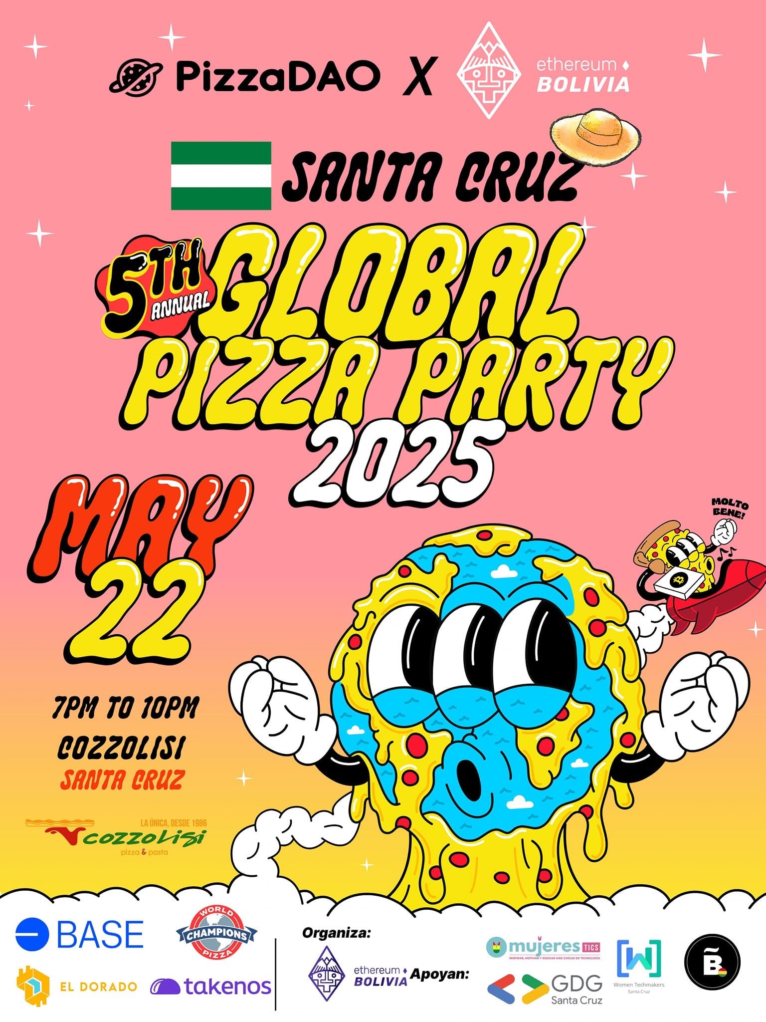 🍕 ¡Santa Cruz se suma al 5.º Global Pizza Party de PizzaDAO! 🇧🇴🎉 Únete a la celebración del Bitcoin Pizza Day, recordando la primera transacción regitrada hecha con Bitcoin.
