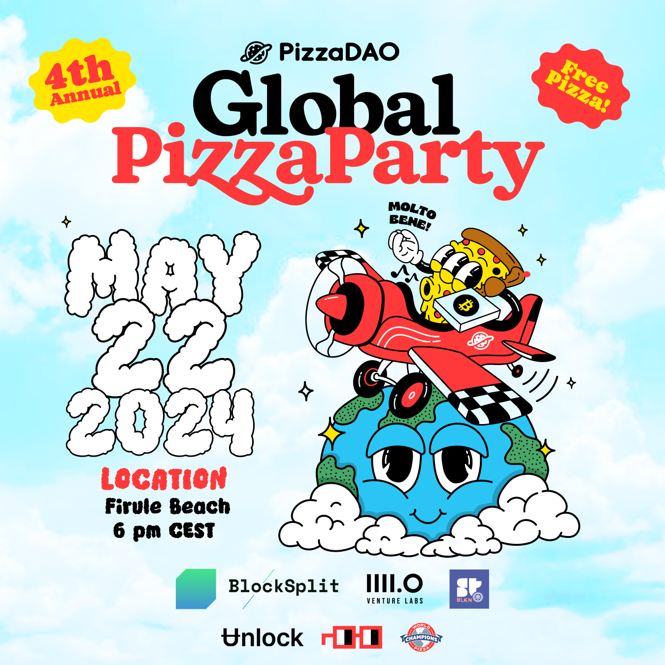 You're invited to PizzaDAO's 4th annual Global Pizza Party on Wednesday, May 22 in honor of Bitcoin Pizza Day. Join us for an evening of delicious pizza, great company, and beautiful beach vibes at Firule Beach, starting at 6 PM!