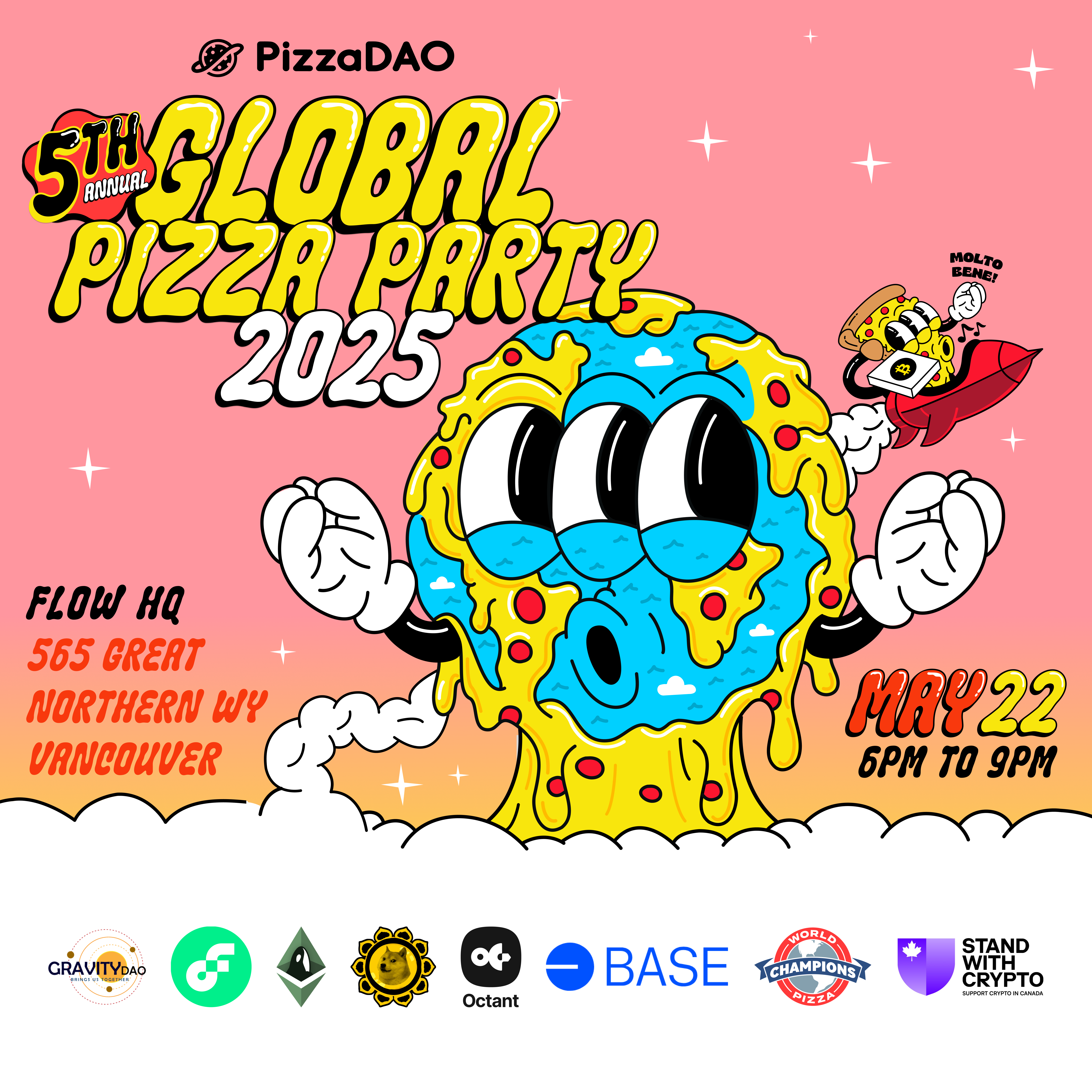 You're invited to PizzaDAO's 5th annual Global Pizza Party in honor of Bitcoin Pizza Day. We're excited to host you in collaboration with our friends Base and the World Pizza Champions.