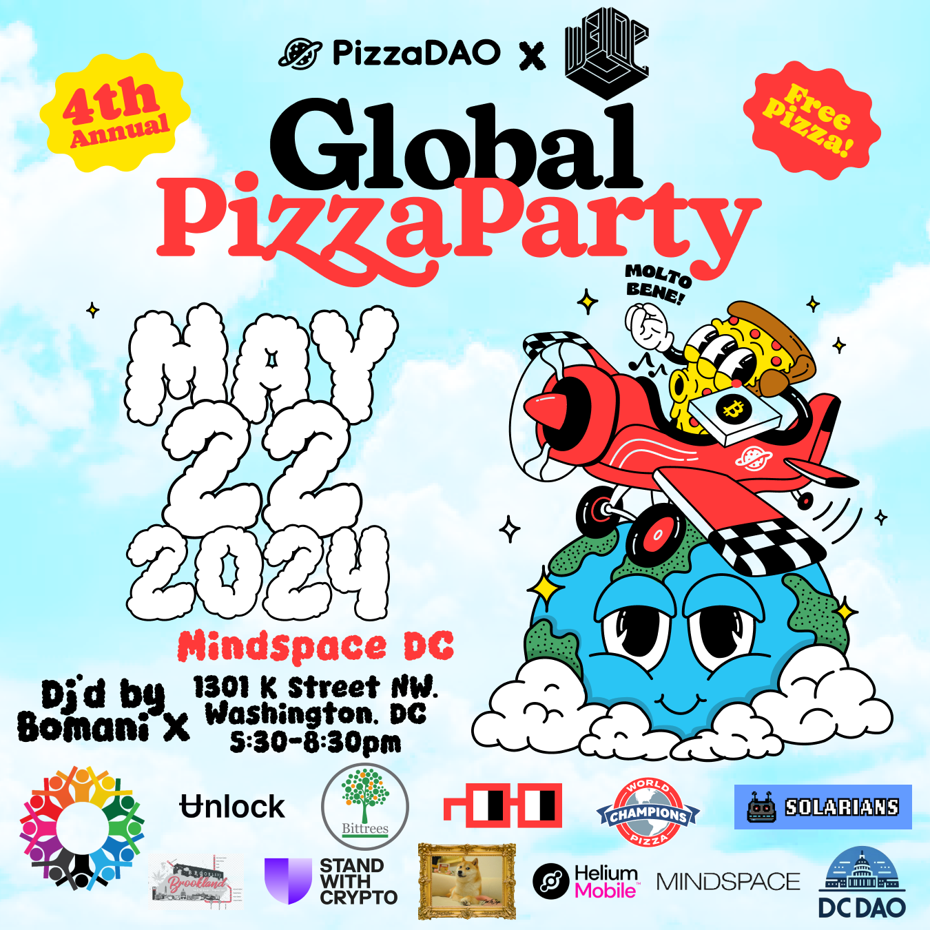 In partnership with our friends at NounsDAO, Unlock Protocol, World Pizza Champions, Stand with Crypto, DC DAO, Solarians, Own the doge & Helium mobile, Web3DC is taking Bitcoin Pizza Day celebrations to a whole new level to commemorate this day. Over 10,000 attendees expected across 150 cities worldwide.