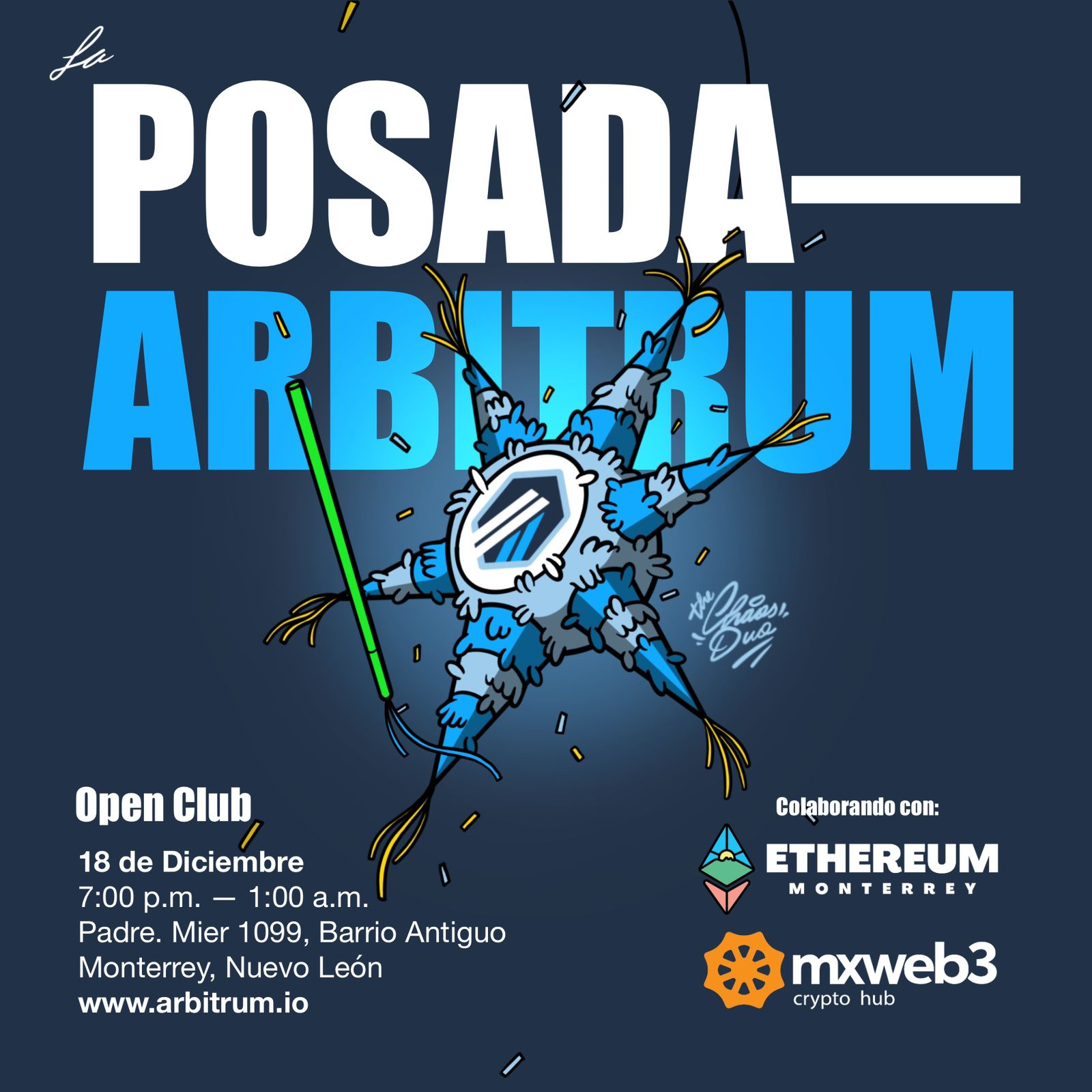 ✨ Merch espectacular que no querrás perderte. 🎁 Dos piñatas llenas de dulces para que saques tu lado más festivo. 🎂 Un increíble pastel temático de Arbitrum. 🤝 Networking con embajadores, delegados y entusiastas de la comunidad. 🍹 Drinks y comida gratis para disfrutar toda la noche. 🎶 Música, arte en vivo y mucha diversión garantizada.