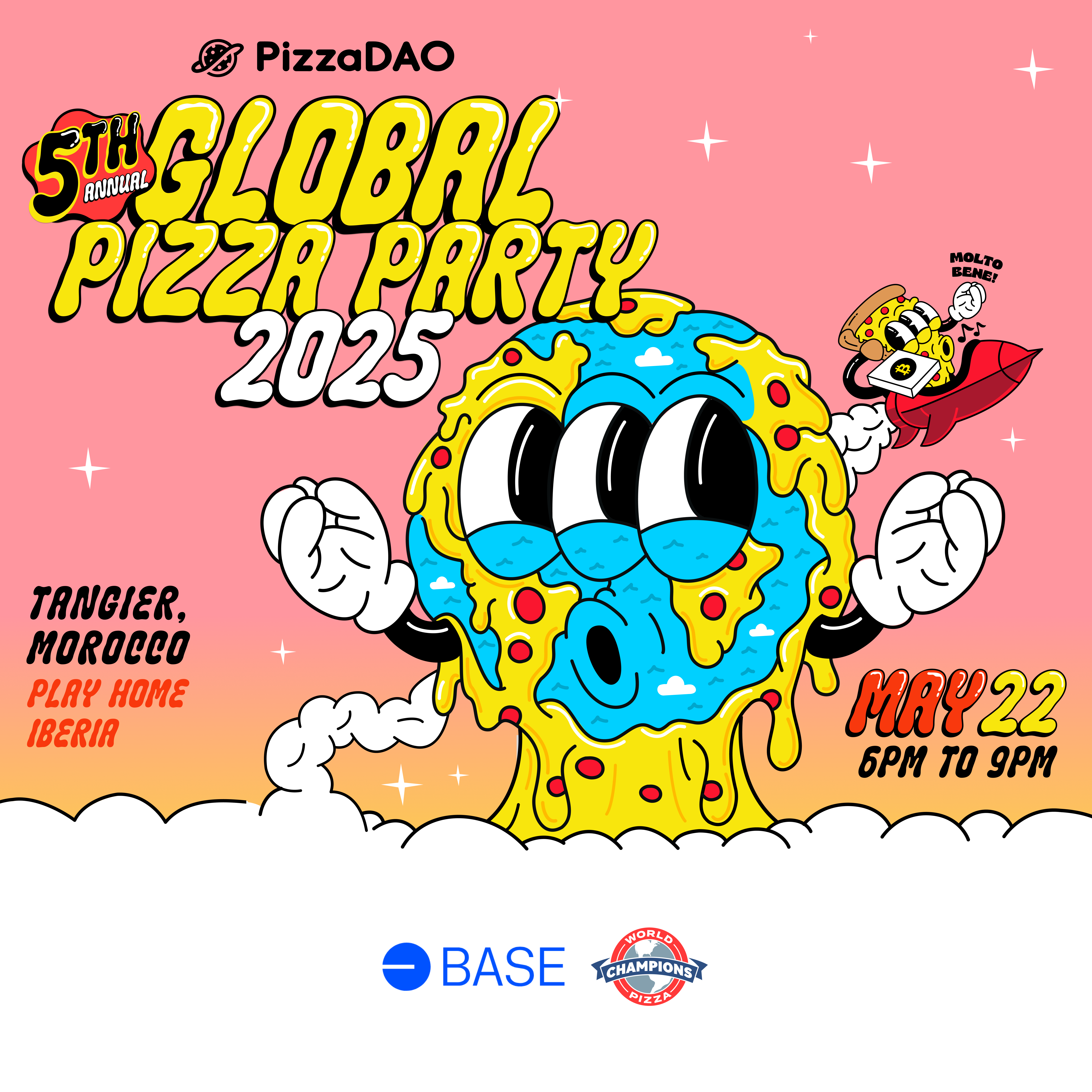 You're invited to PizzaDAO's 5th annual Global Pizza Party in honor of Bitcoin Pizza Day. We're excited to host you in collaboration with our friends Base and the World Pizza Champions.