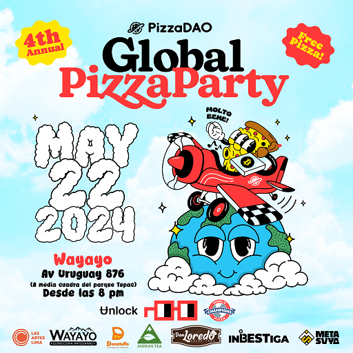 Este evento es impulsado por PizzaDAO y Nouns Amigos. Nuestro host local, César Loredo, te espera este miércoles 22 en Wayayo para compartir con chelas 🍻 y pizza 🍕 gratis para los 50 primeros.
