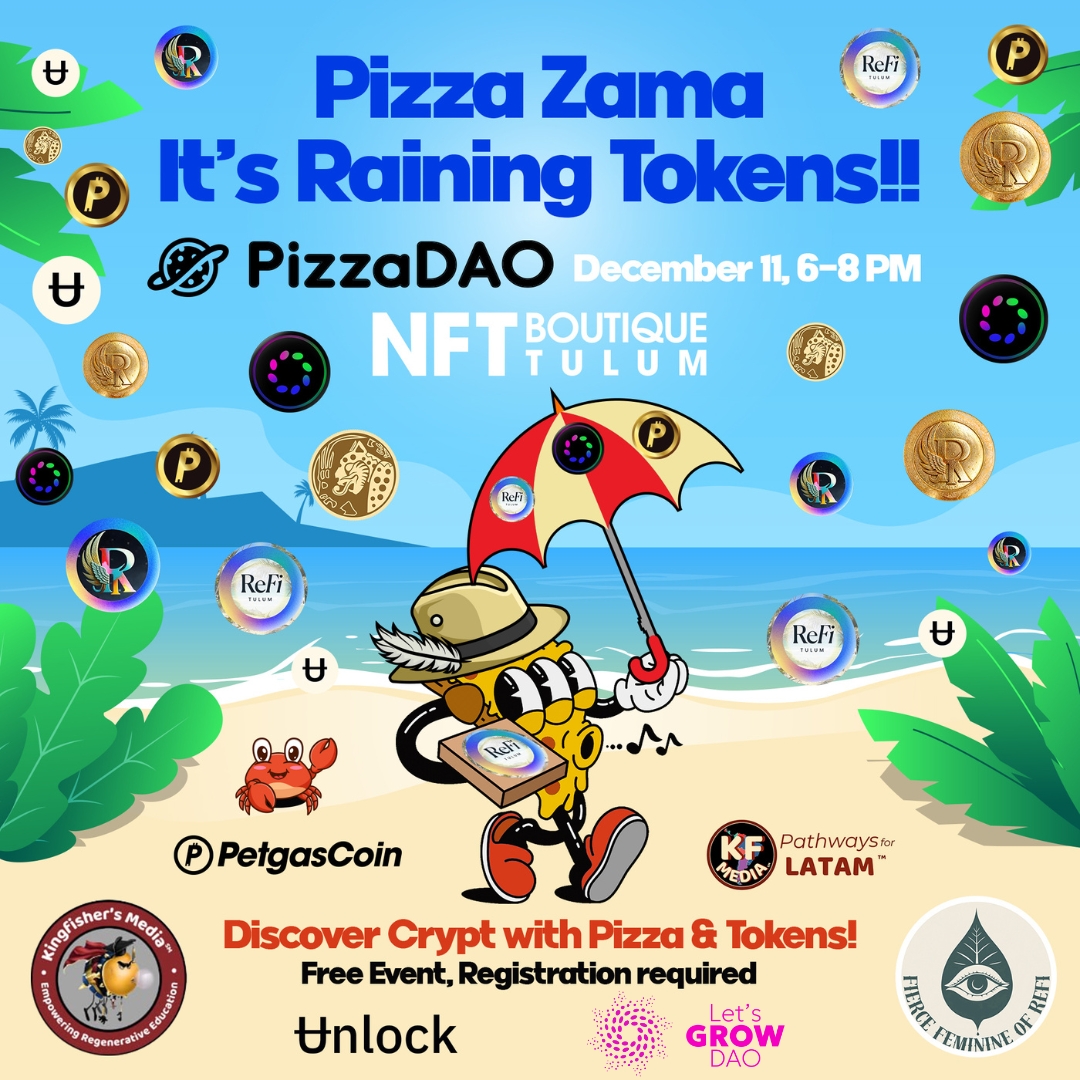 Join us for an unforgettable evening at the NFT Boutique in Tulum as PizzaDAO, LetsGrow DAO, Unlock Protocol and $Earth team up to introduce you to the exciting world of Cryptocurrencies. Fresh from the Citizen Wallet: Empowering Communities in Web3 workshop, attendees can UNLOCK their first tokens through the Unlock Protocol. Enjoy mouthwatering pizza while engaging with crypto education, wallet activations, and ReFi tokens. Designed for those just starting out or curious about the world of crypto, you’ll connect, learn, and experience the magic of Web3 in a community-driven event where tokens—and connections—are plentiful!