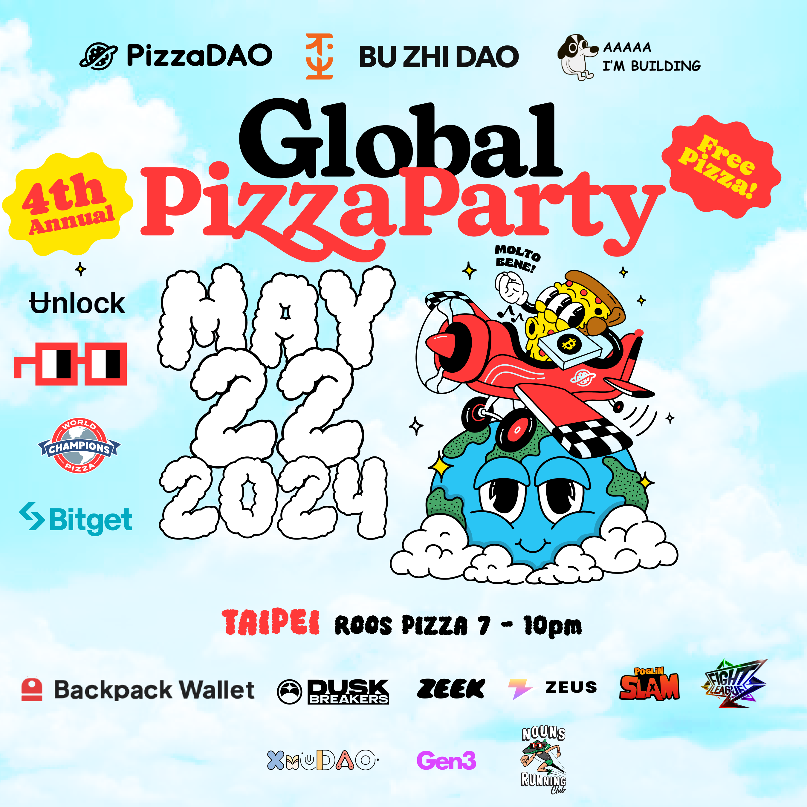 You're invited to PizzaDAO's 4th annual Global Pizza Party in honor of Bitcoin Pizza Day. Co-hosted by Bu Zhi DAO and AAAAA I'm Building