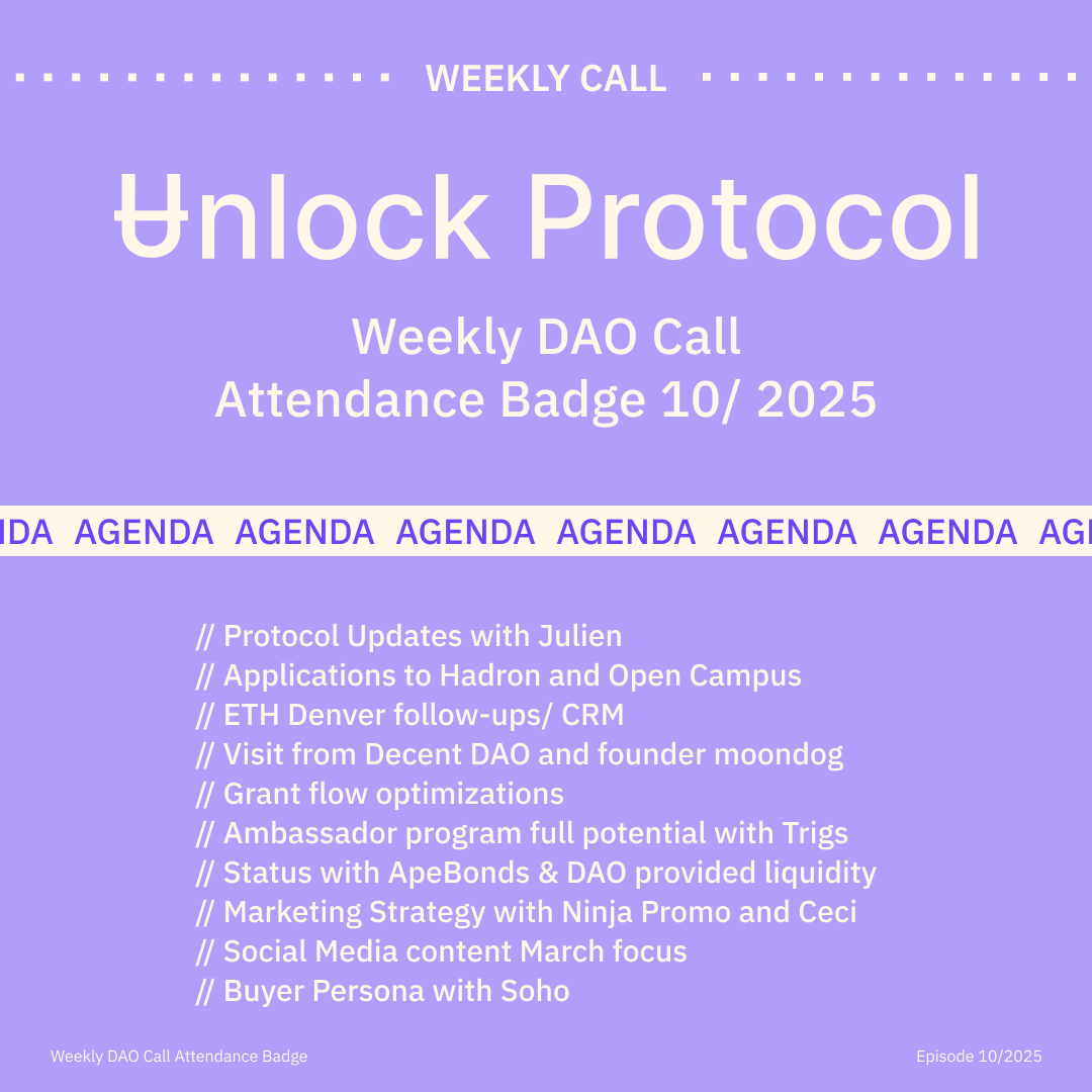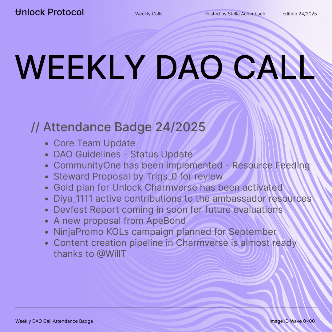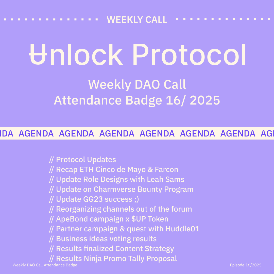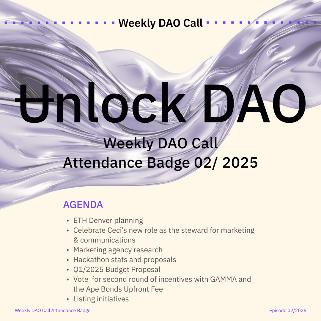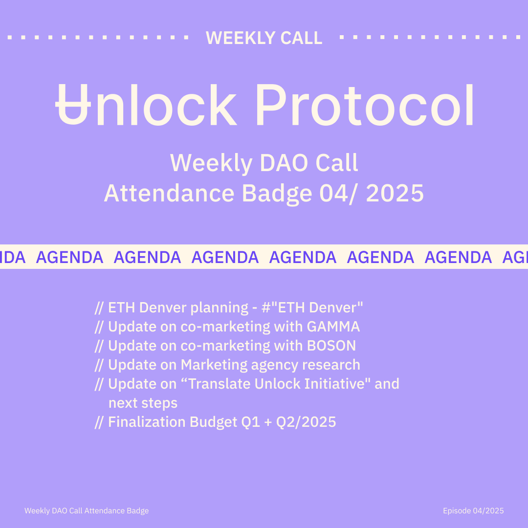 Join the Unlock DAO Charmverse space to learn more about each of our DAO Calls from 2024 and don't miss out on future proof of attendance tokens!