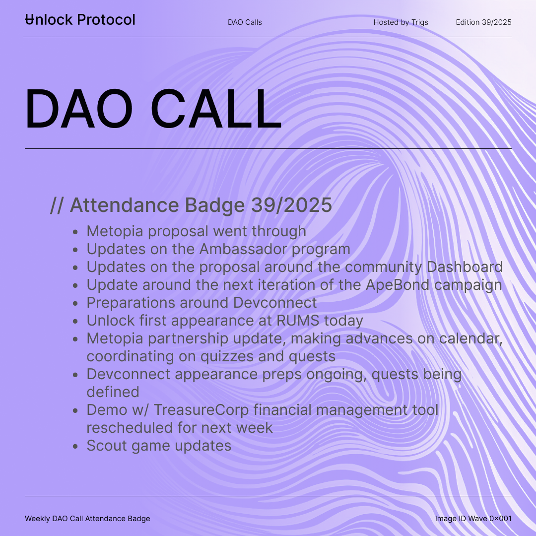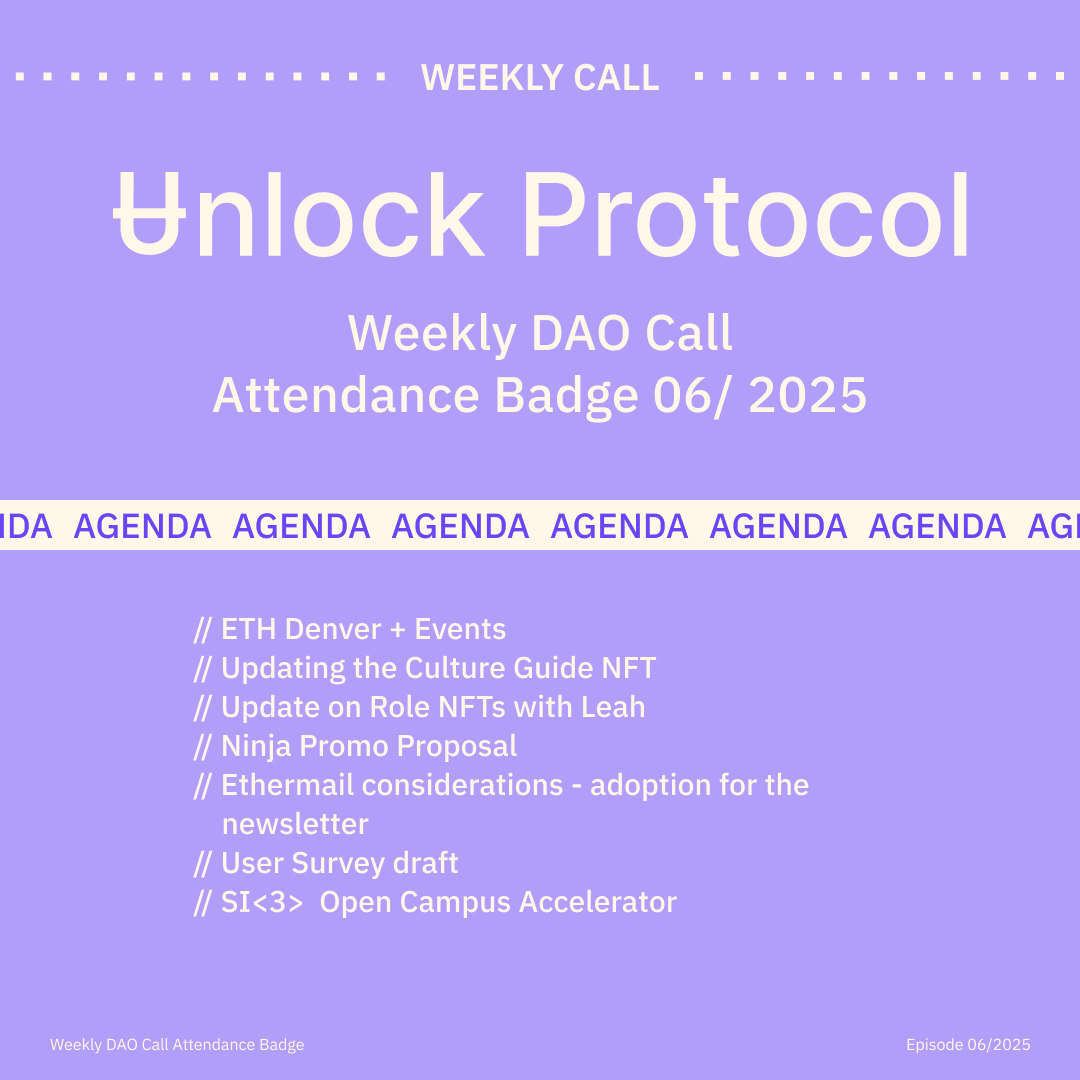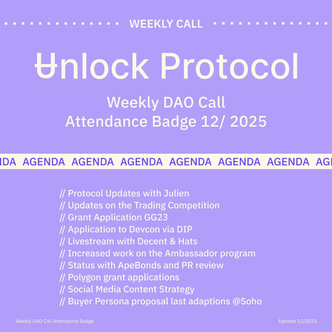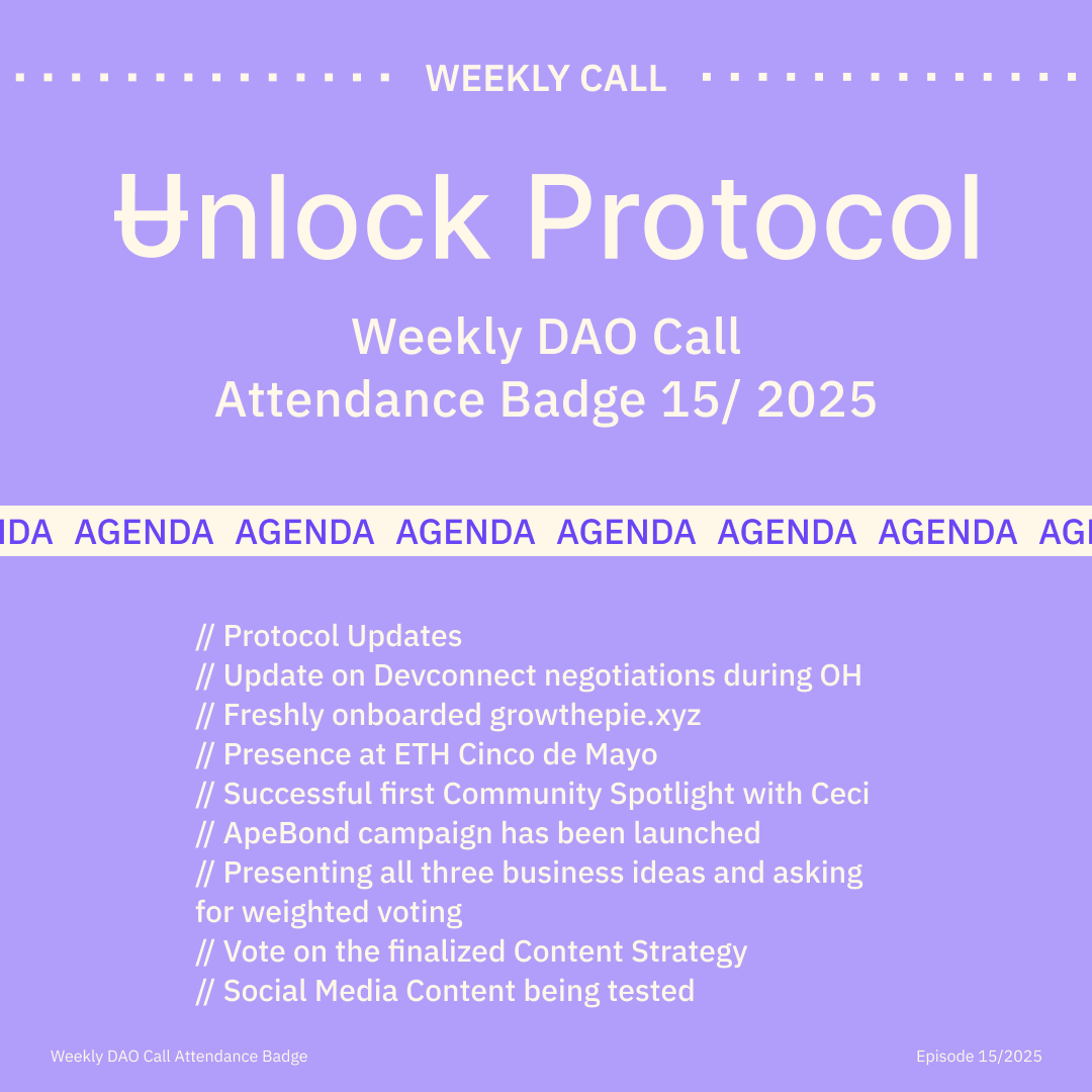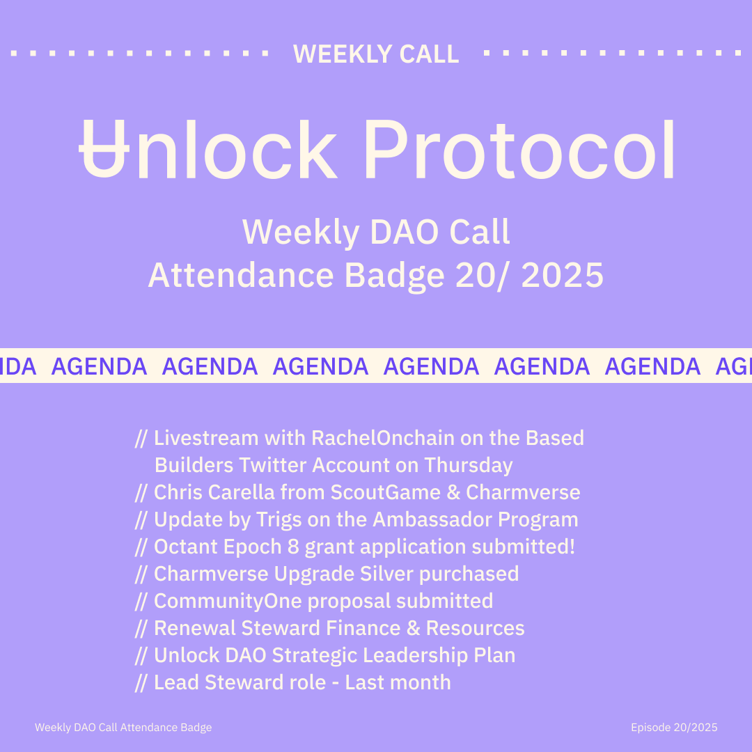 Join the Unlock DAO Charmverse space to learn more about each of our DAO Calls from 2024 and don't miss out on future proof of attendance tokens!