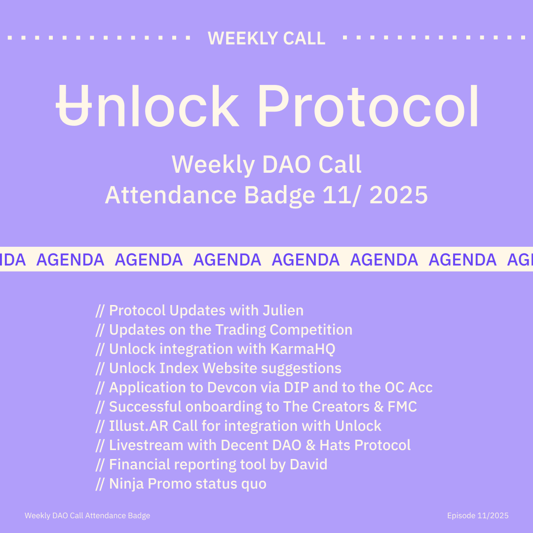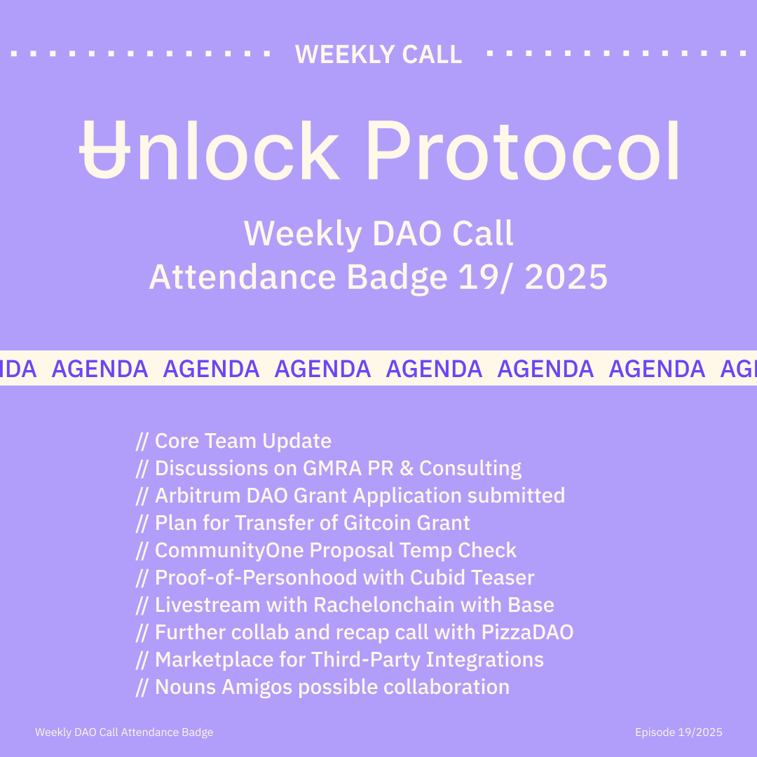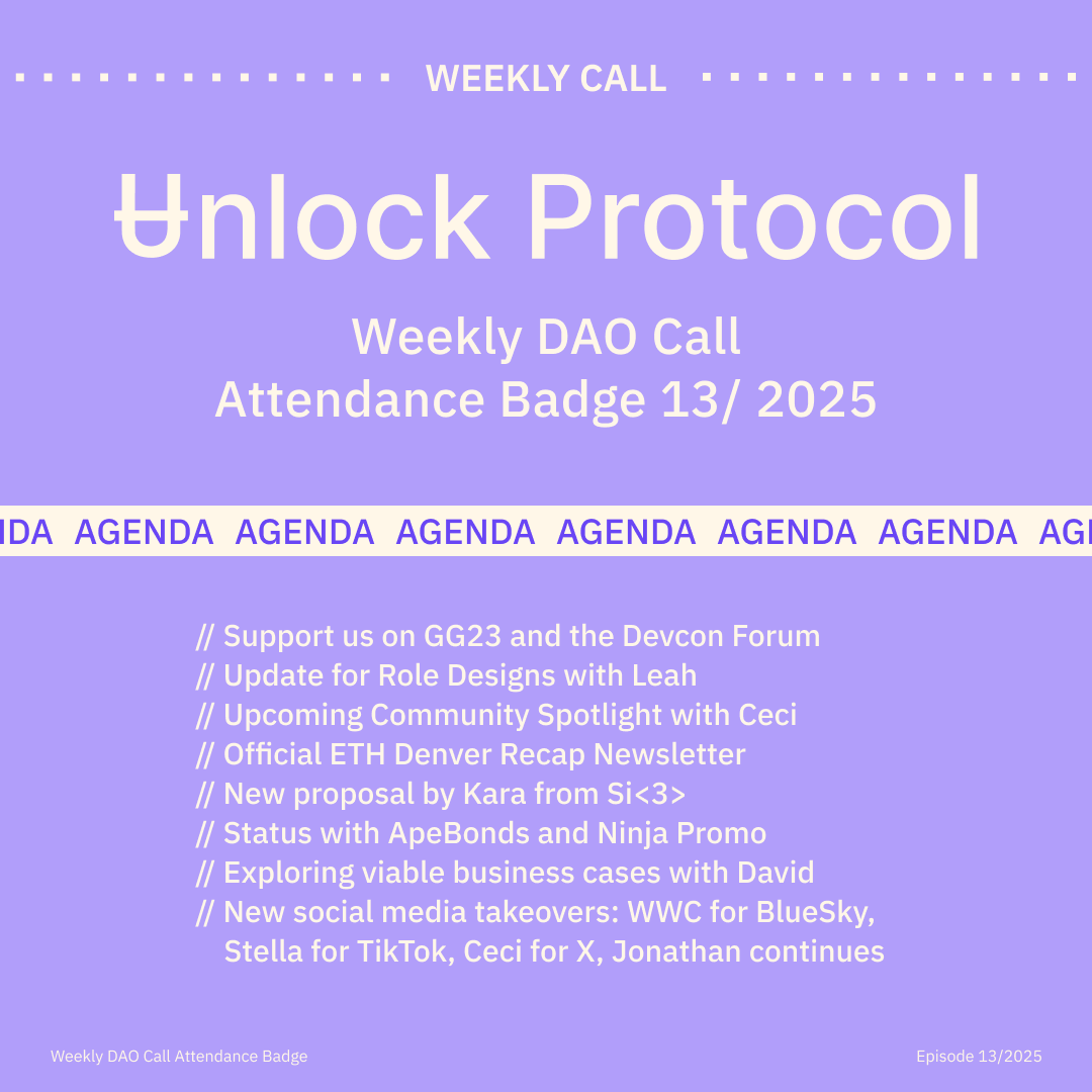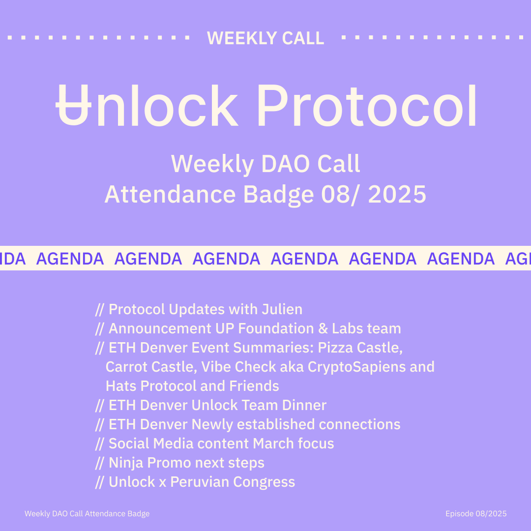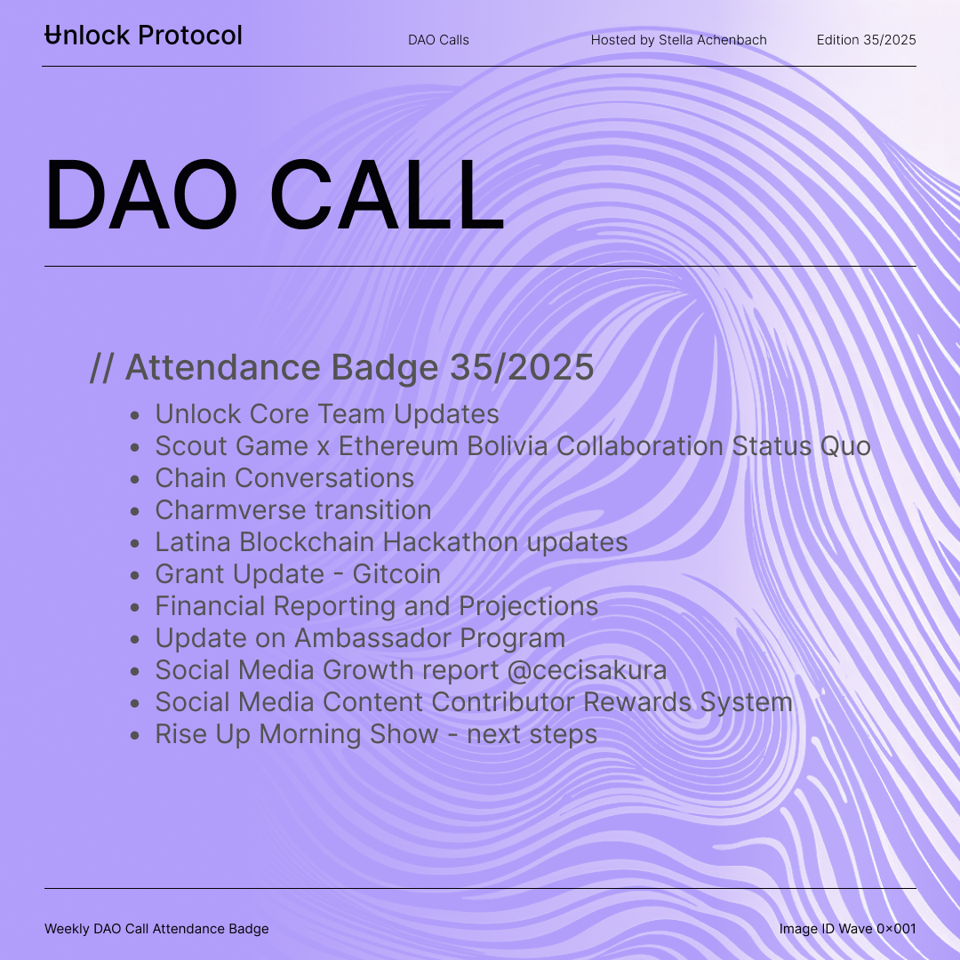Join the Unlock DAO Charmverse space to learn more about each of our DAO Calls from 2024 and don't miss out on future proof of attendance tokens!