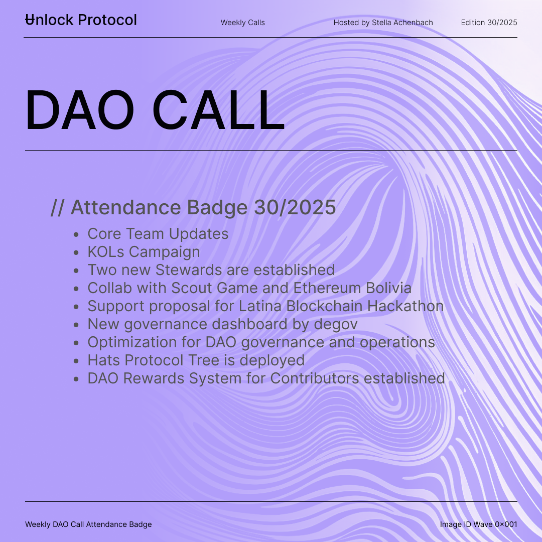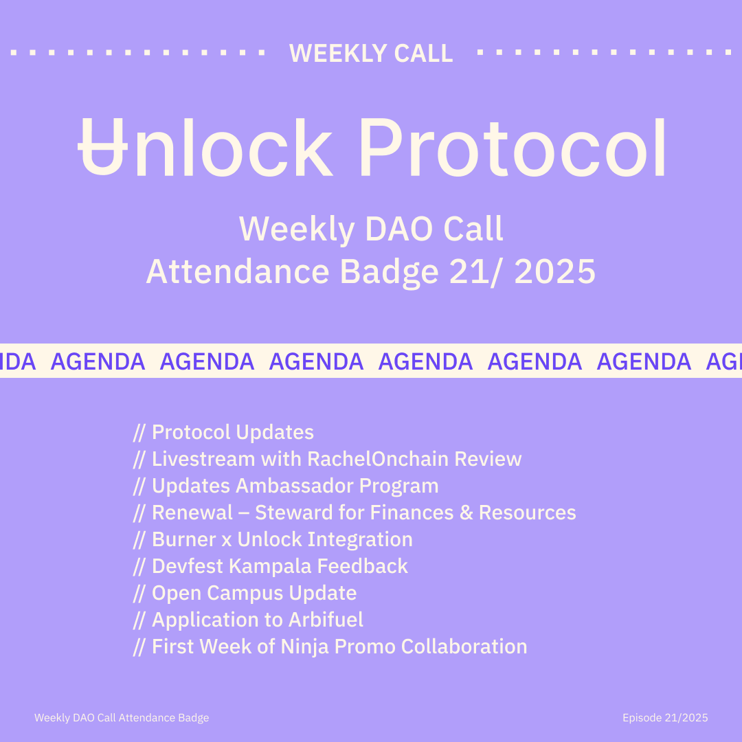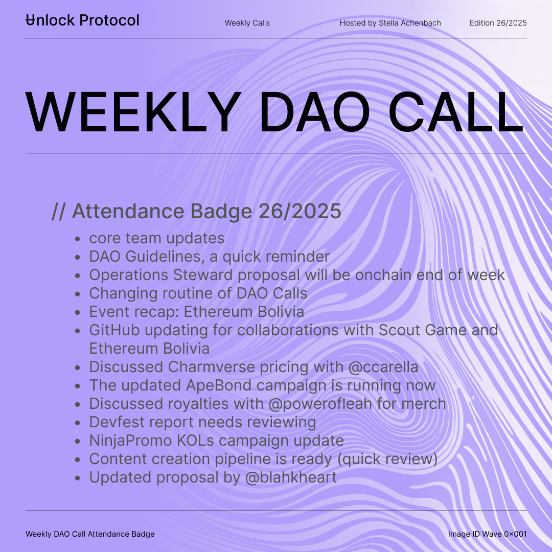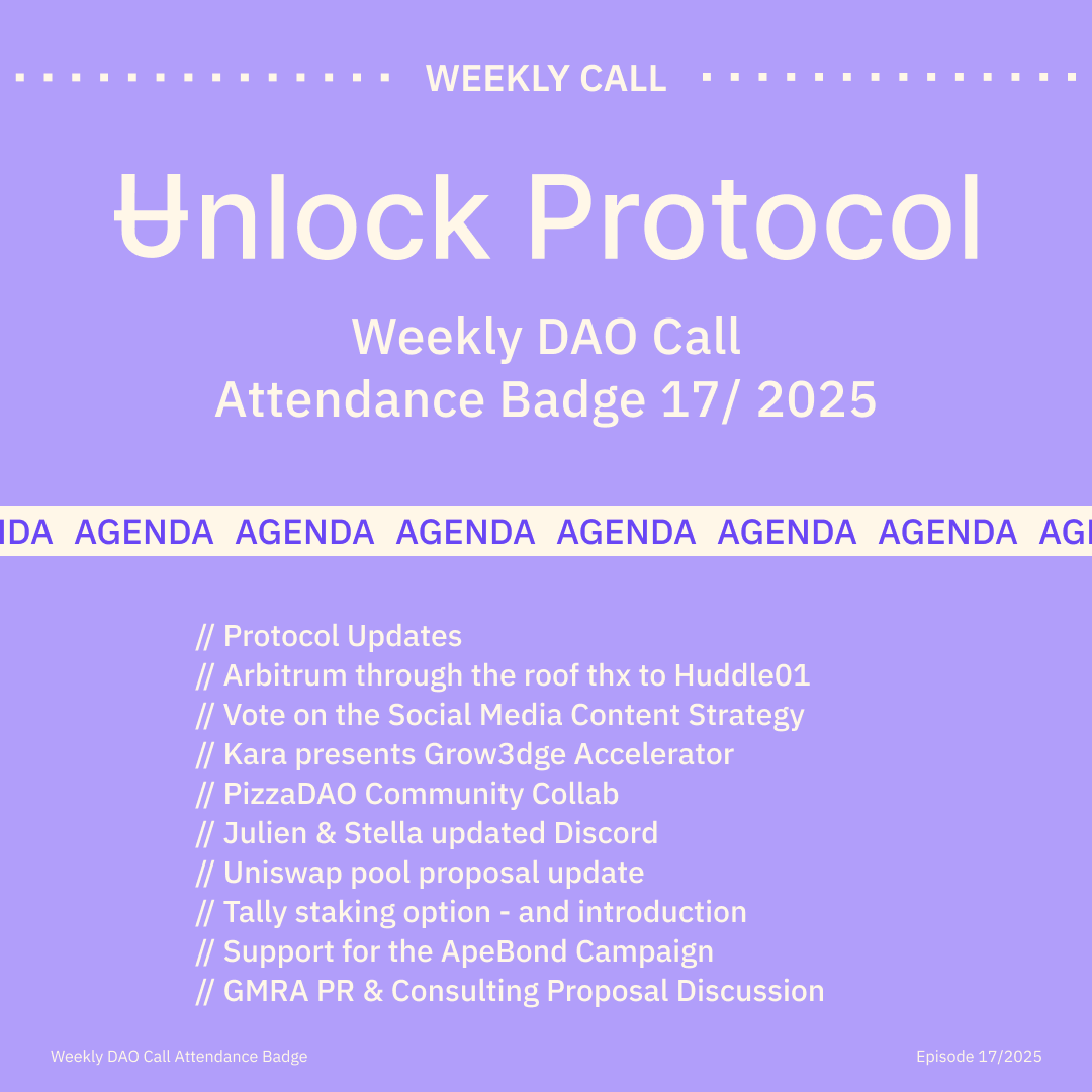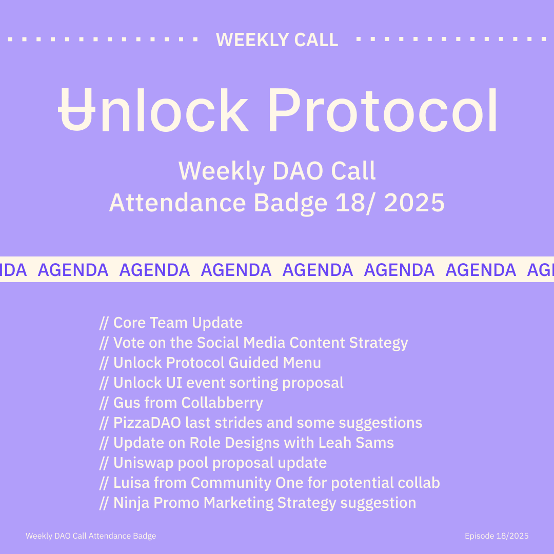 Join the Unlock DAO Charmverse space to learn more about each of our DAO Calls from 2024 and don't miss out on future proof of attendance tokens!